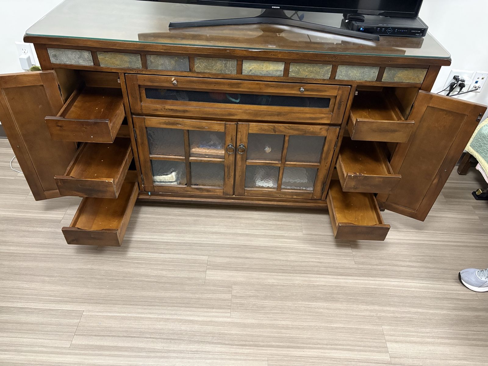 PayPalSturdy wood media console has a warm brown finish with natural slate tile inlays along the top. This piece features two side cabinets that open to reveal three pull-out drawers each, providing plenty of hidden storage. Center section has a mesh-fronted flip-down door for electronics and two glass-paneled doors below for display. Top is protected by a custom-cut glass sheet. Entertainment Center piece only. OBO