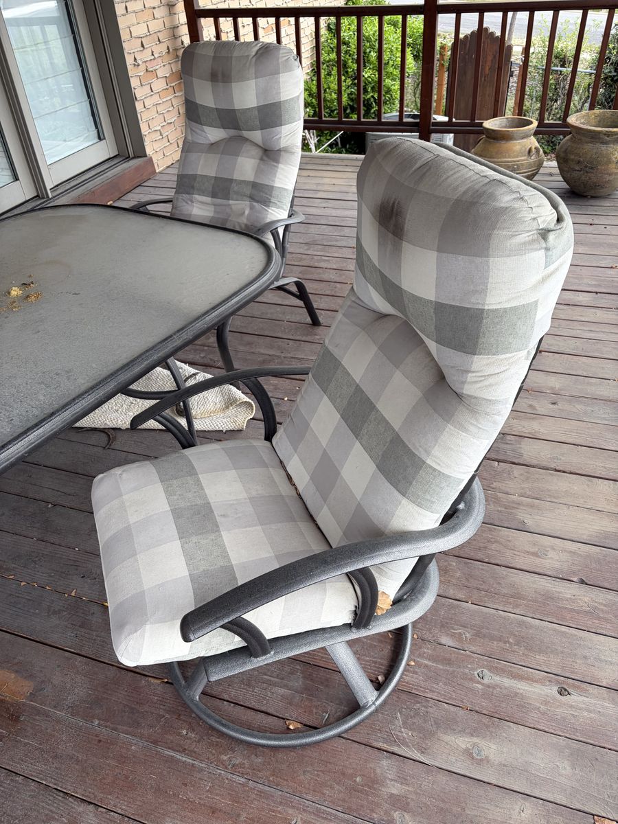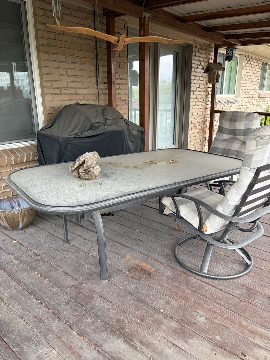 ApplePayLarge metal patio table and four chairs with cushions. cushions need to be cleaned