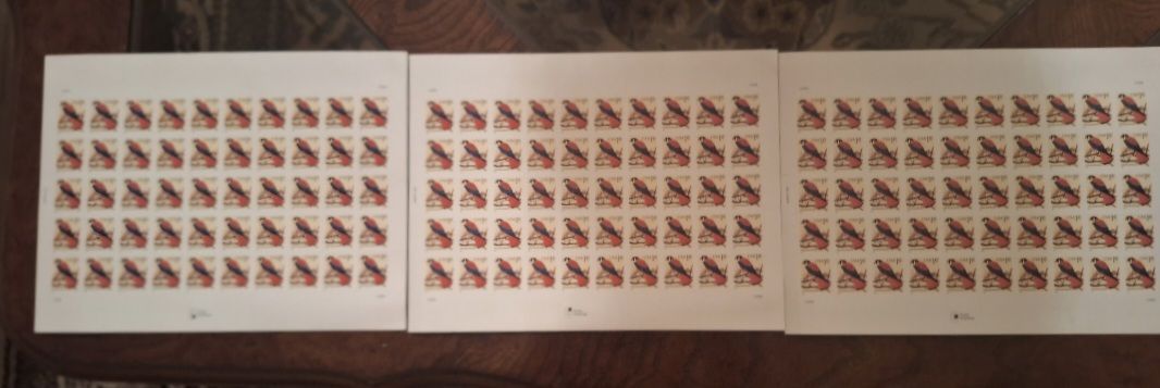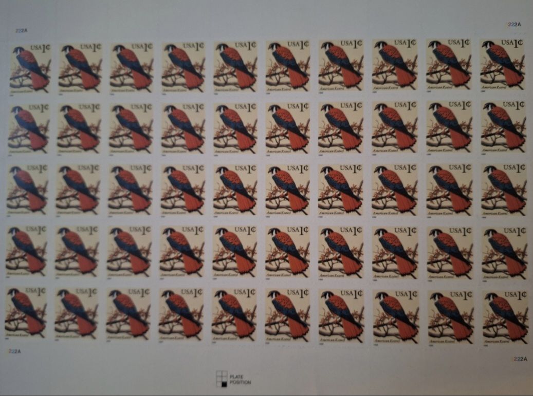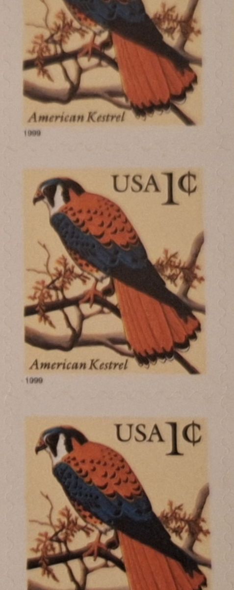Three Sheets of 50 American Kestrel Stamps, From the Year 1999 Unused Postage Stamps, 1 Cent Stamps. Self-Adhesive. 3 sheets of 50 for $22. Or one sheet of 50 for $10. Cash only.