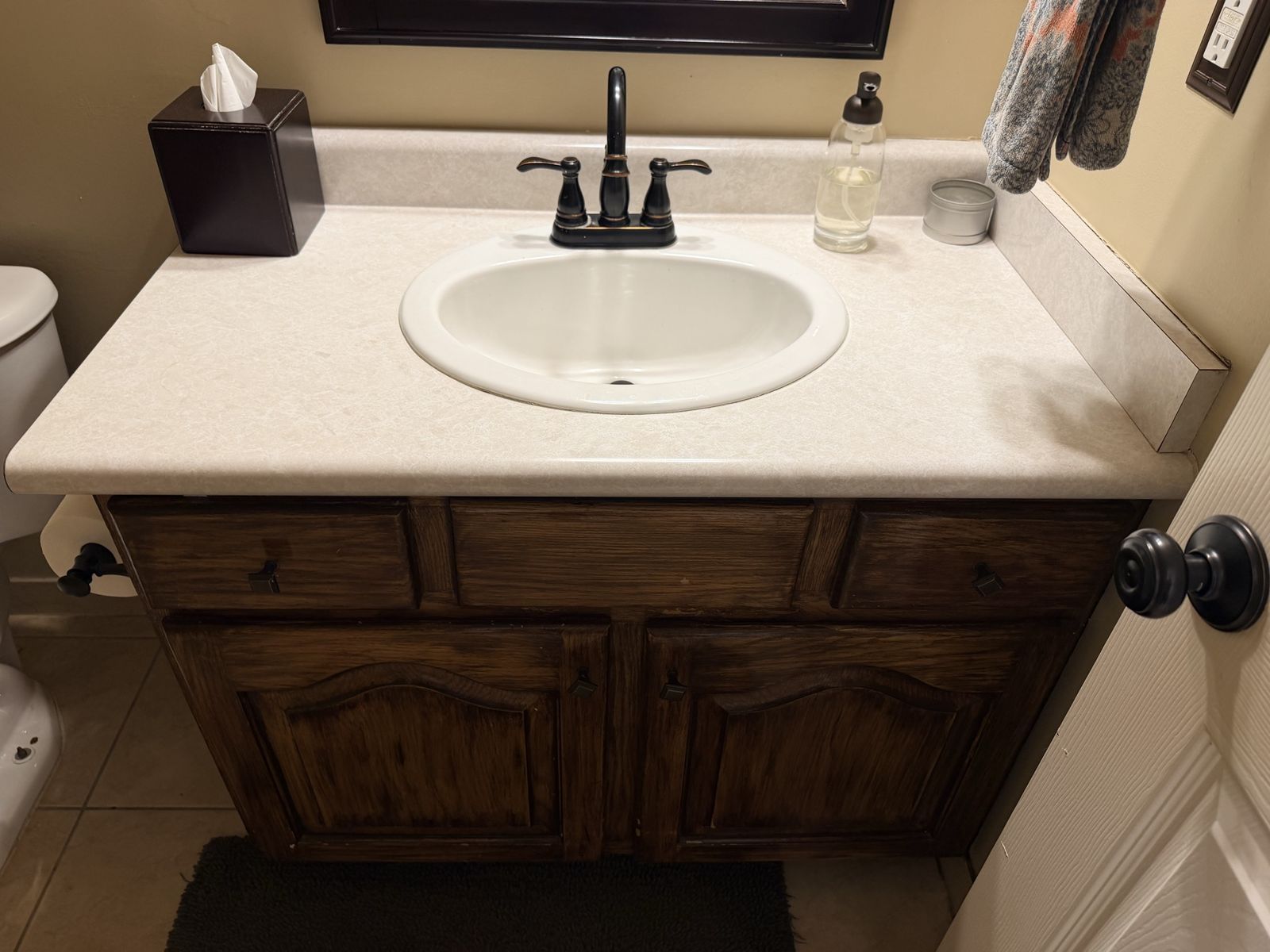 ZelleBathroom vanity solid oak can be re finished but also looks super nice as is. Counter top sink and faucet included.