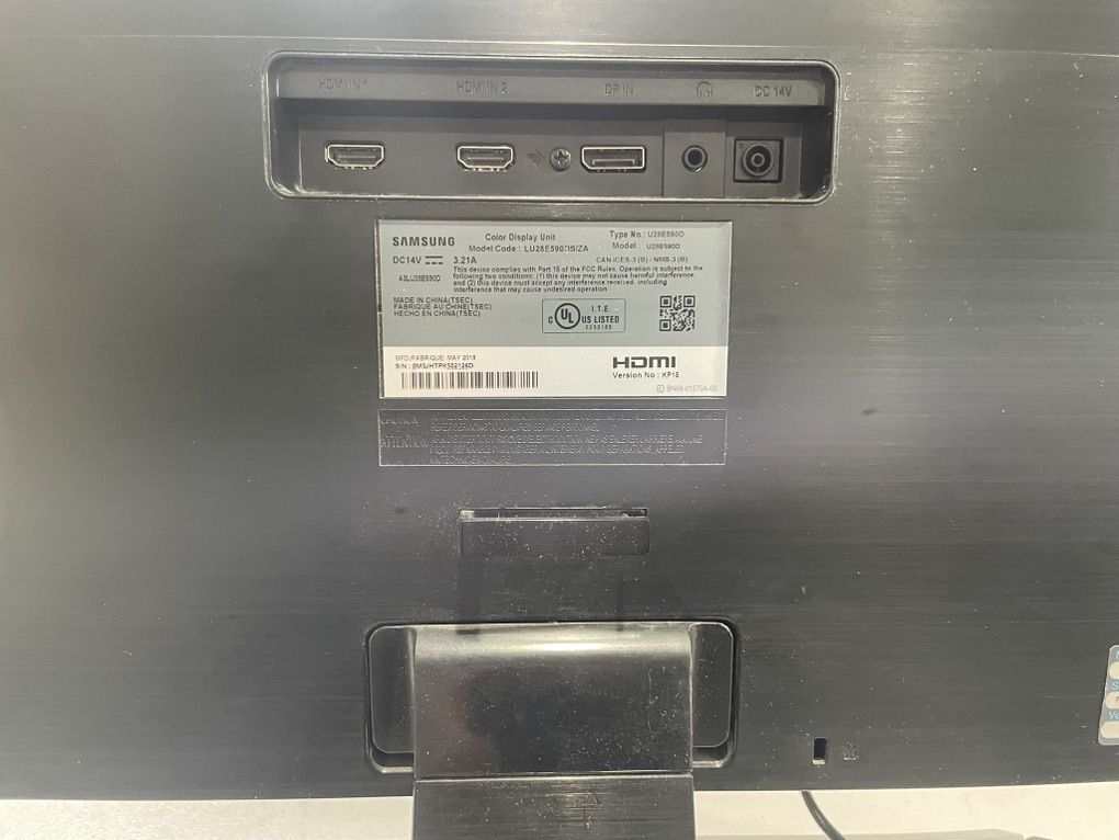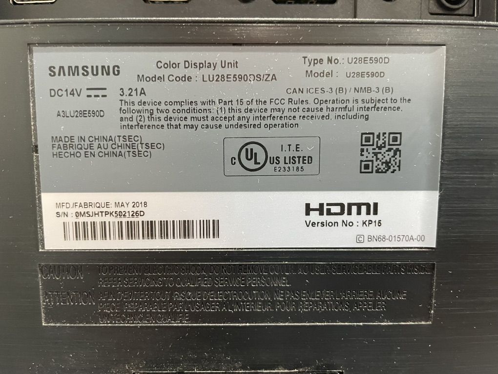 The Samsung LU28E590DS/ZA is a 28-inch UHD 4K (3840 x 2160) LED-lit gaming monitor from the UE590 series. Key features include a 60Hz refresh rate, 1ms response time, AMD FreeSync technology, and HDMI 2.0 connectivity