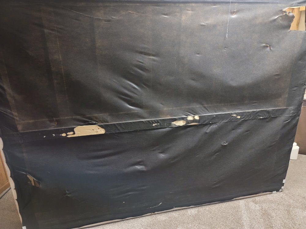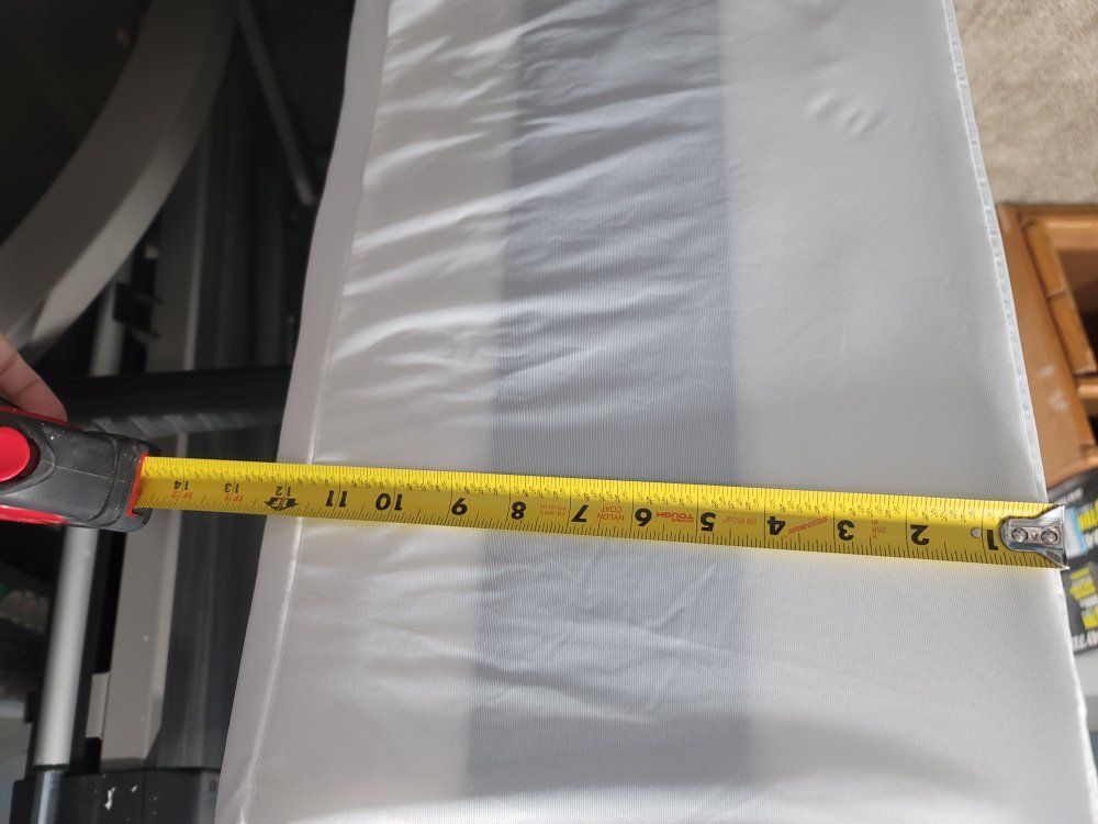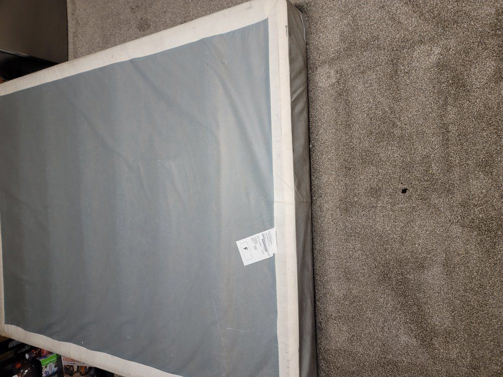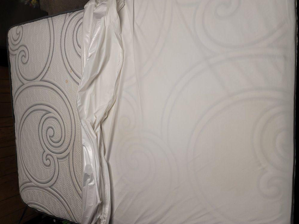 mattress is 12 inches thick and is memory foam, gel and spring so its very heavy. need 2 strong men to carry it out. some water stains but that's it, other then that excellent condition no rips, no bed bugs ect. box spring is pretty worn but still works great. needs new fabric cash only and serious buyers only