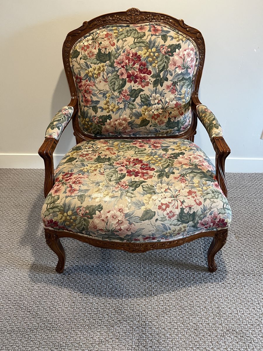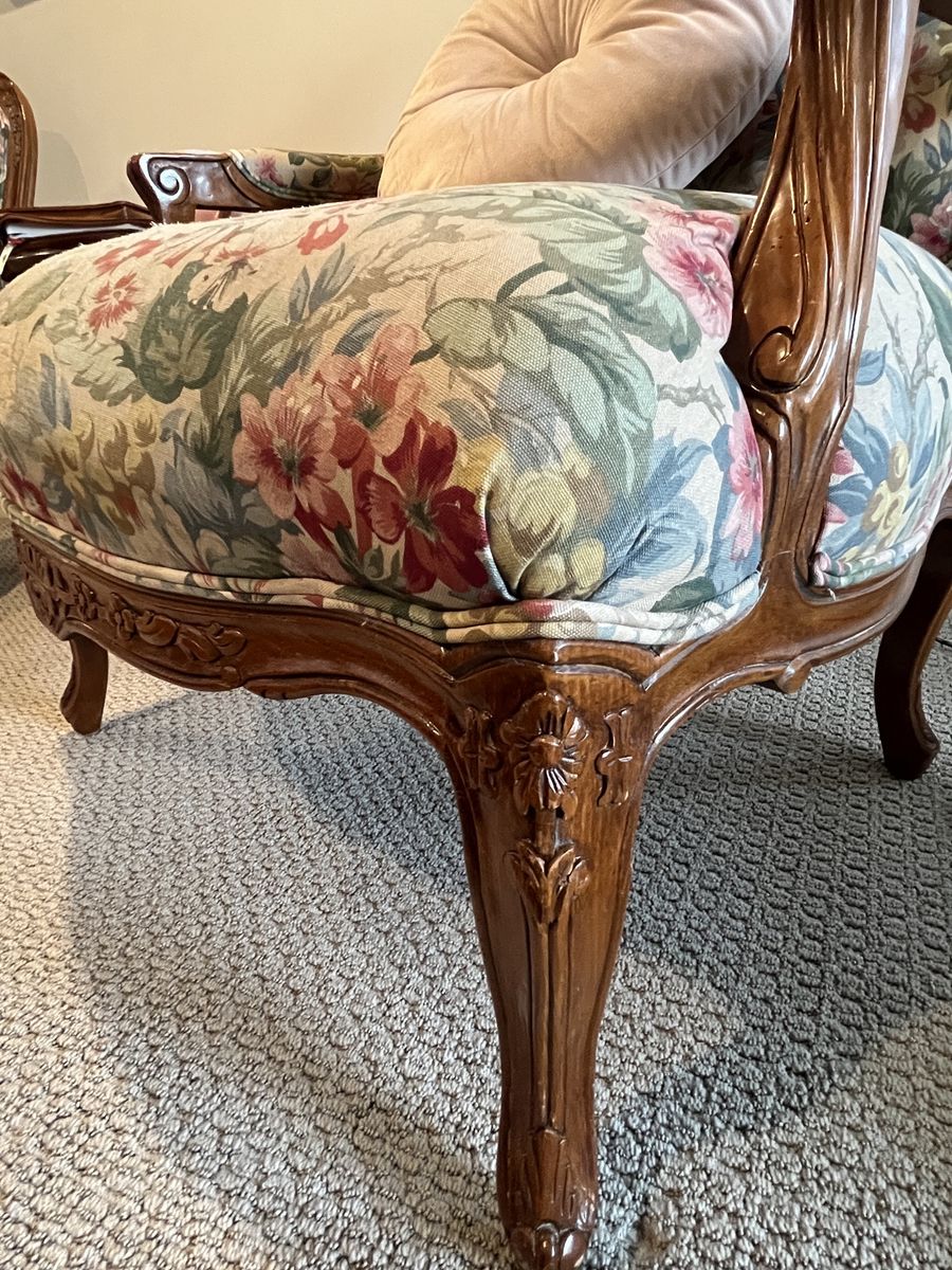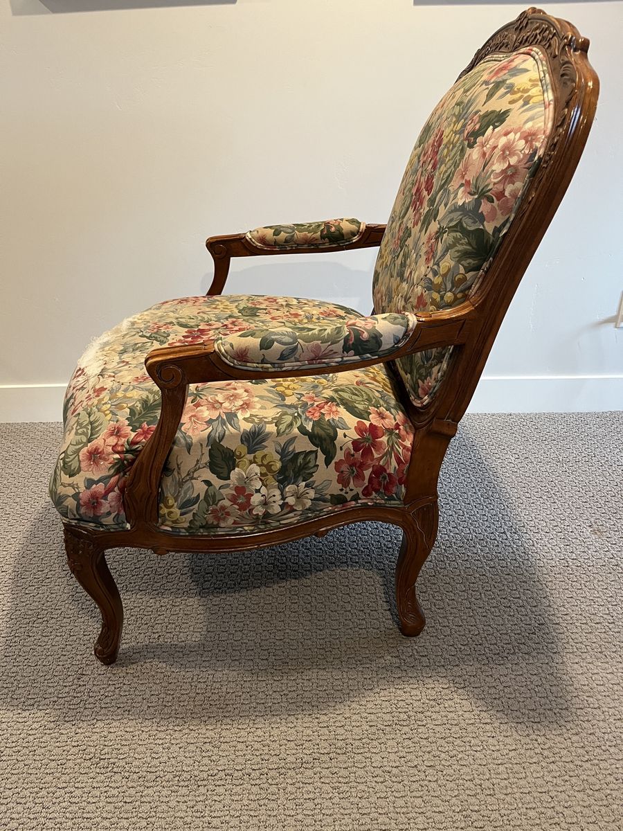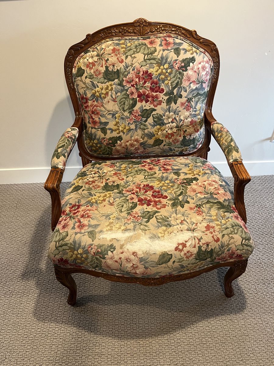 ApplePayThis set of vintage chairs has certainly stood the test of time. It features hand-carved walnut wood frames with beautiful Louis XV Fauteuil style detailing and a seven inch thick cushion. Absolutely ZERO particle board used in the creation of these chairs, which means they will continue to last. They need a little love to have their full potential realized, particularly in replacing the upholstery. They have been the silent supporting guardians of many late night conversations, bible studies, and storybook reading, and the wear and tear on these reflect the full lives that they’ve lived. Thankfully, the wood is in wonderful condition and they come from a NO PET and NO SMOKING home. Do you think you might be the next person to add to their story?
