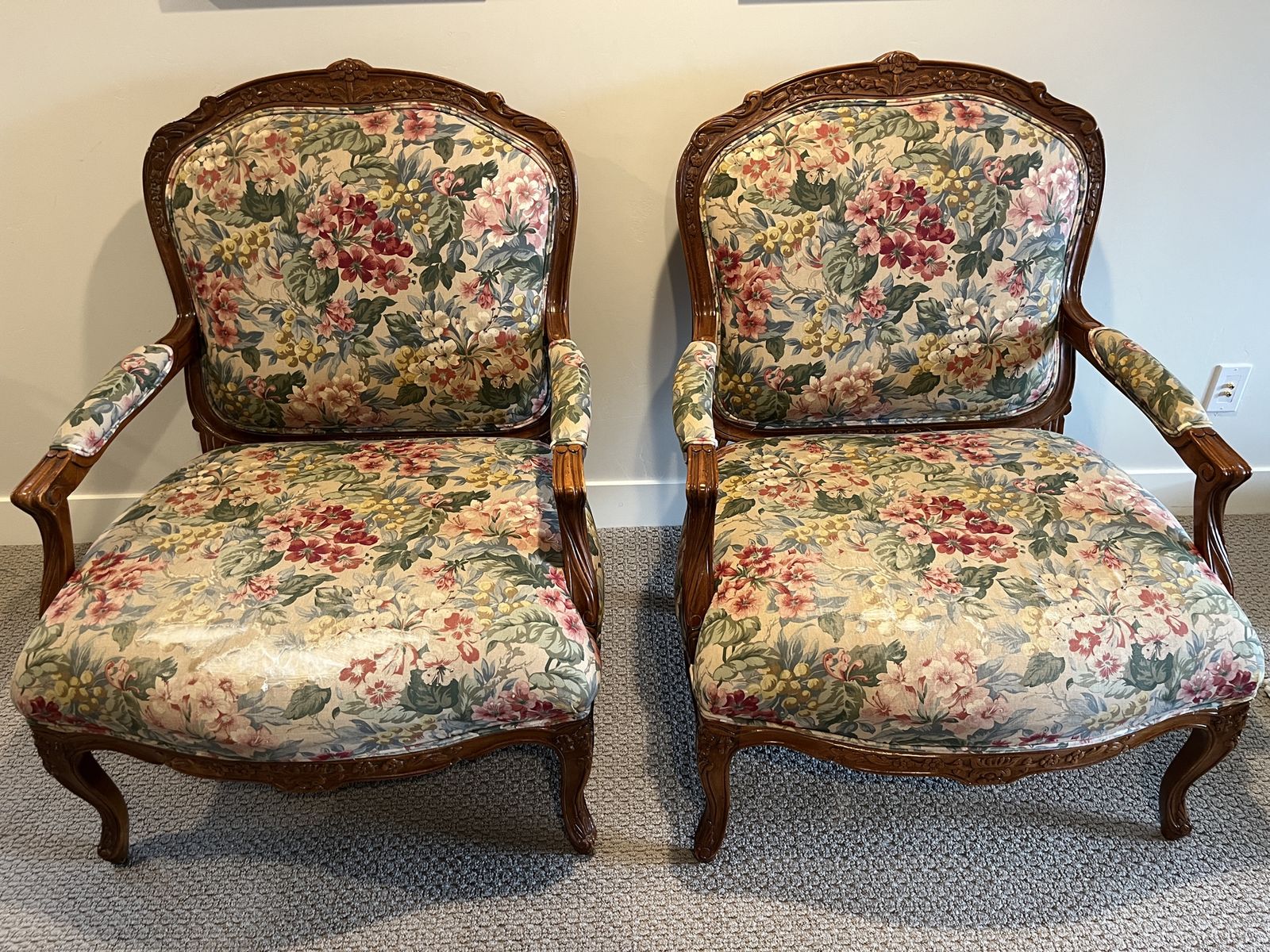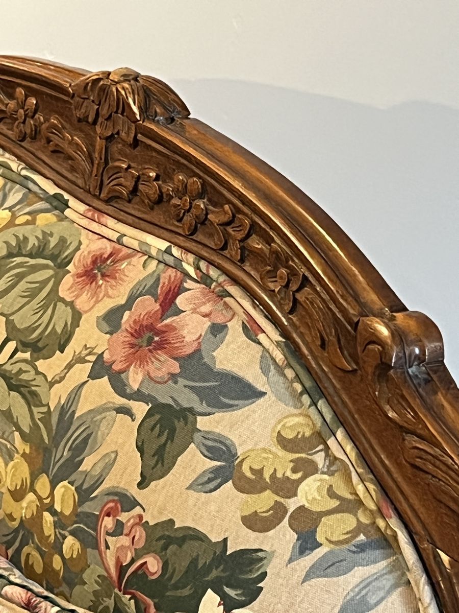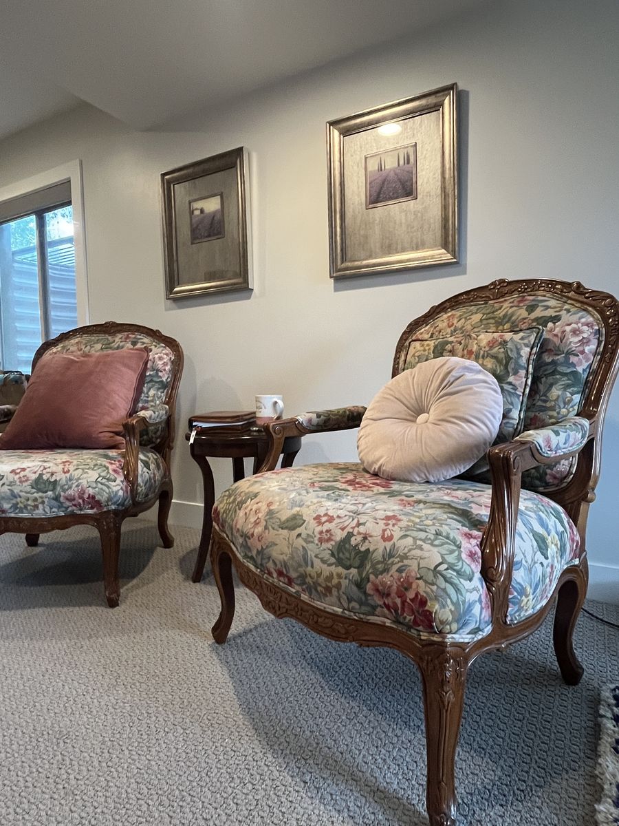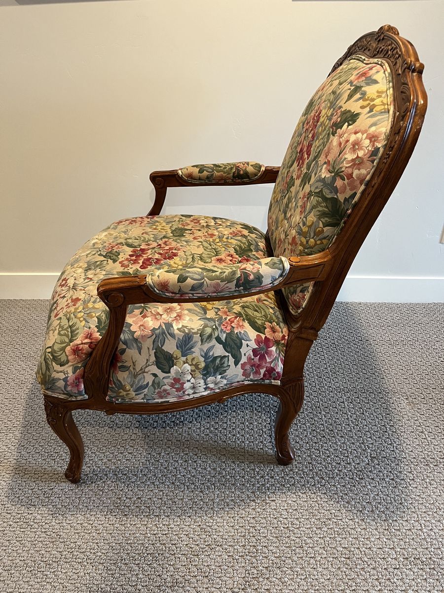 ApplePayThis set of vintage chairs has certainly stood the test of time. It features hand-carved walnut wood frames with beautiful Louis XV Fauteuil style detailing and a seven inch thick cushion. Absolutely ZERO particle board used in the creation of these chairs, which means they will continue to last. They need a little love to have their full potential realized, particularly in replacing the upholstery. They have been the silent supporting guardians of many late night conversations, bible studies, and storybook reading, and the wear and tear on these reflect the full lives that they’ve lived. Thankfully, the wood is in wonderful condition and they come from a NO PET and NO SMOKING home. Do you think you might be the next person to add to their story?