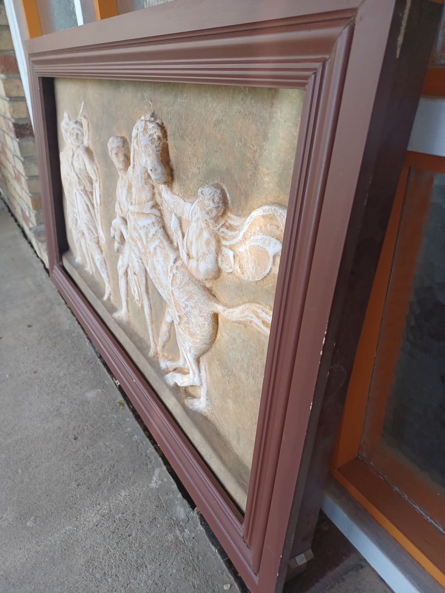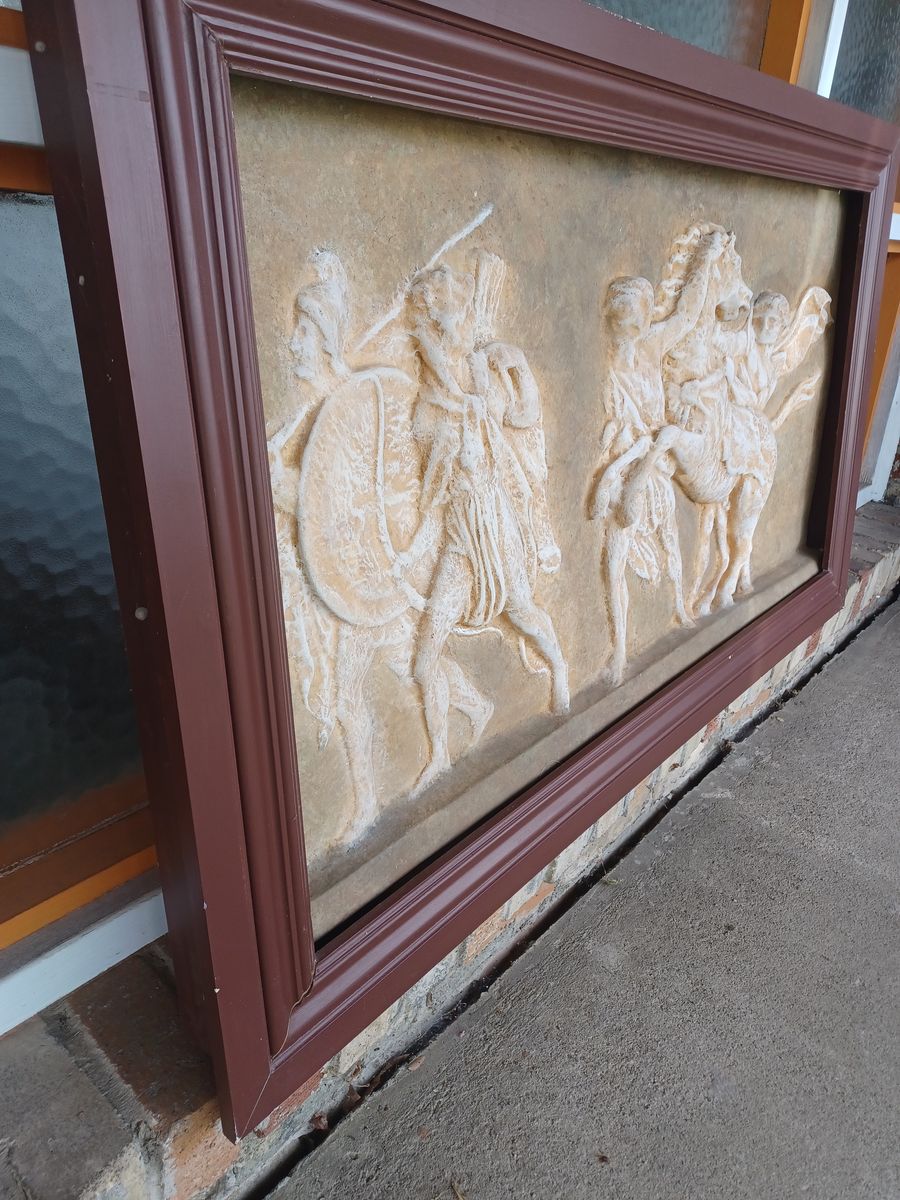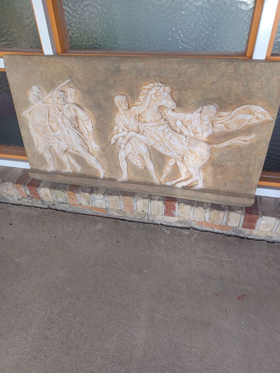 Very nice piece depicting a Roman scene to either have in your home or to hang outside in a garden area.