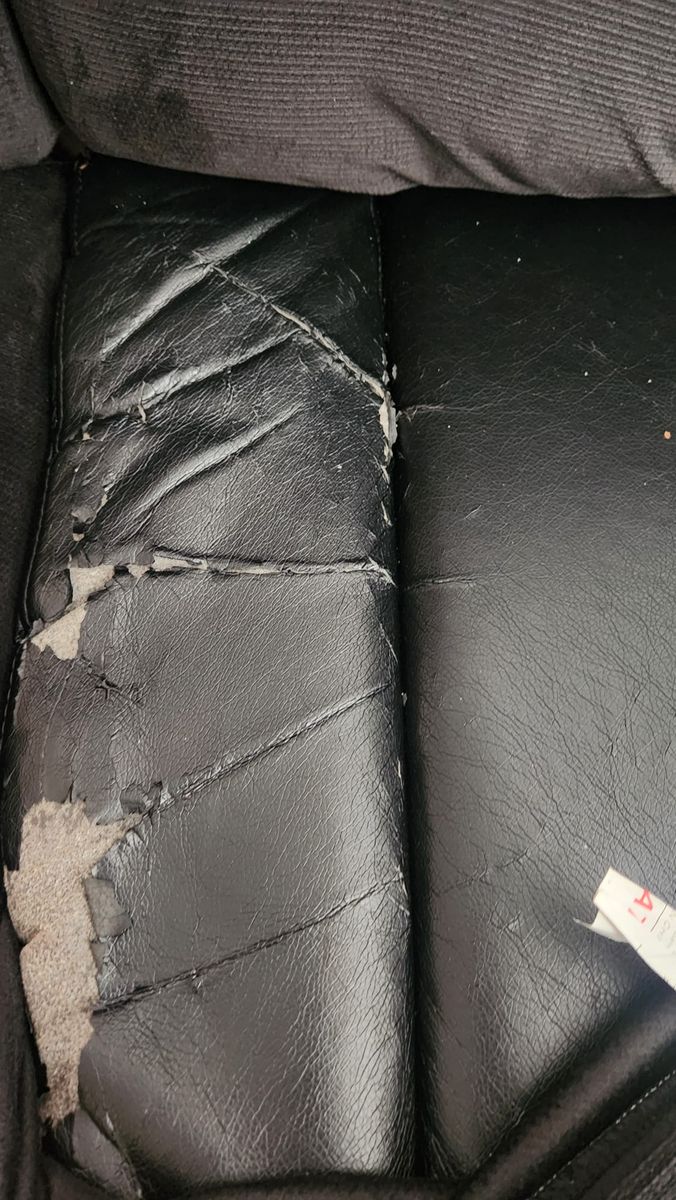 There is peeling on three of the seats from normal use. Because of that, all seats except the one with the pull down tray have fitted cloth covers. We spent about $200 on the covers. They stay in place well and are included with the couch. The right armrest had peeling too, and it is covered with a matching repair fabric.