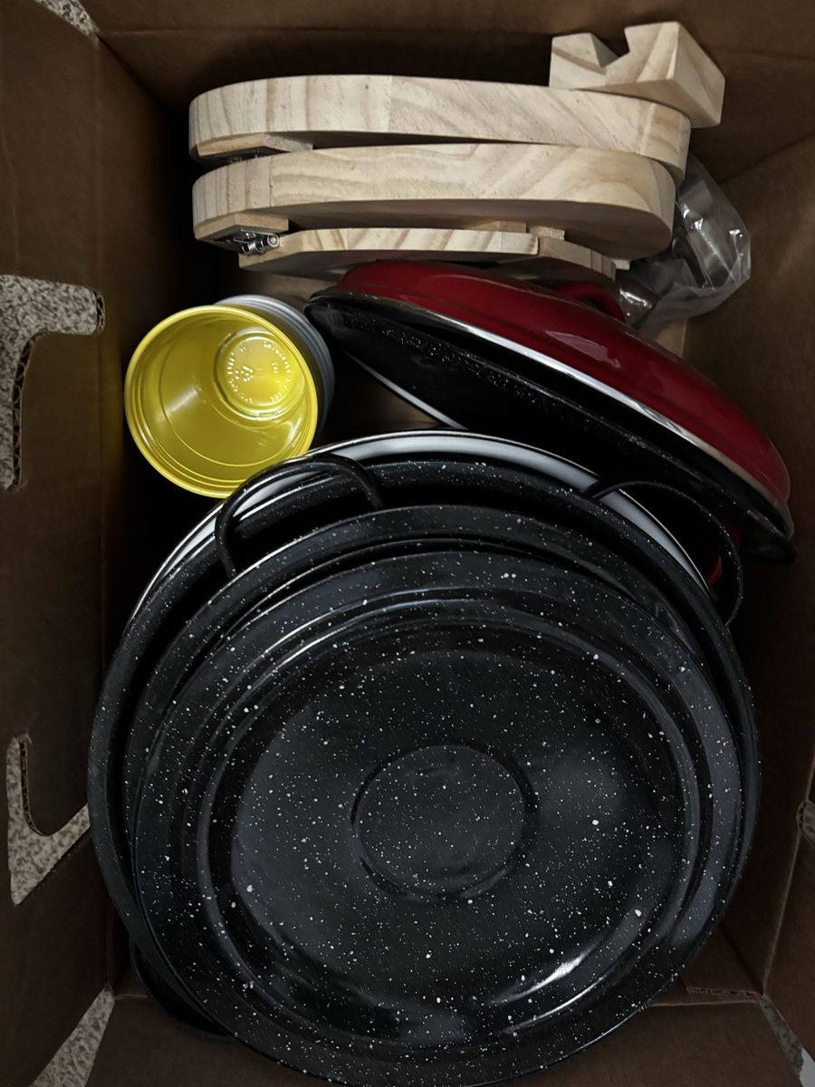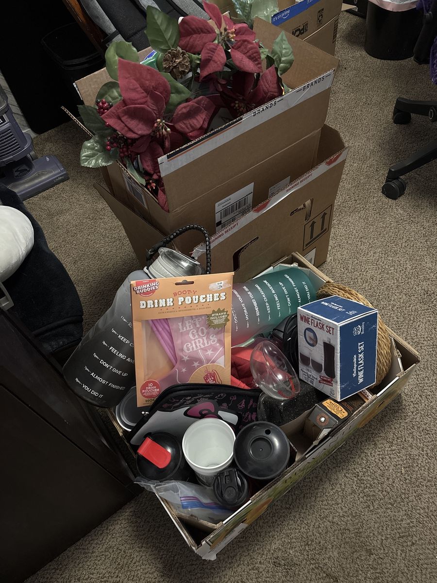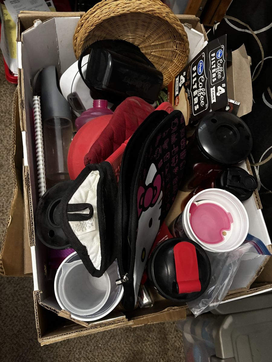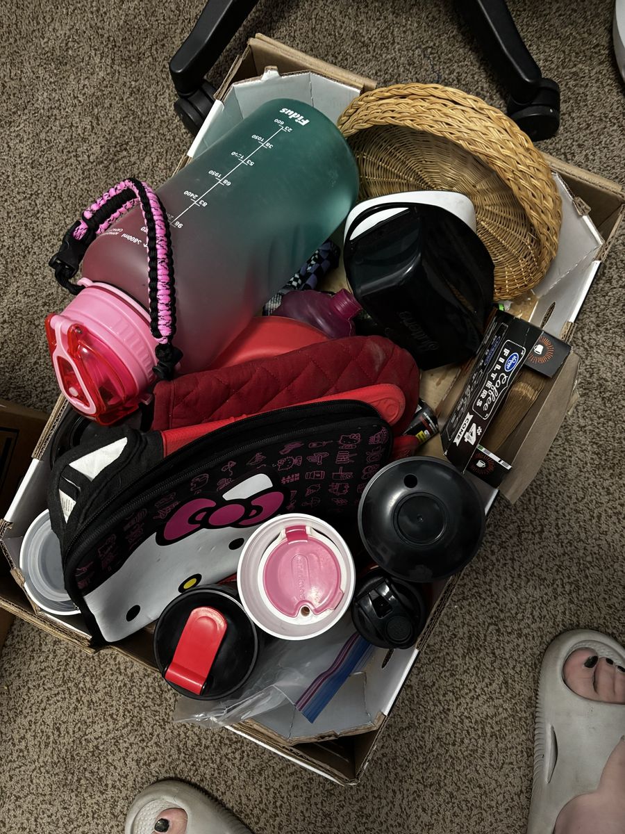 Venmo$40 takes it all! Some items are brand new never opened!! Two theater cups from It Chapter 2, food scale, butter dish, microwave baked potato pouch, water bottles, oven mitts, Bucked Up shaker bottle/cup, Frozen Snackees cup, SL Bees cups, margarita glass, collapsible wine flask set, Dino pencil holder, huge pots that are dented so would be good for non food things, booty drink pouches, coffee filters, wicker paper plate holders, 2 gallon water bottles with encouraging marks to hit throughout the day, Hello Kitty electronics pouch/bag, and much more! Will keep adding more treasures as I find more to add!!