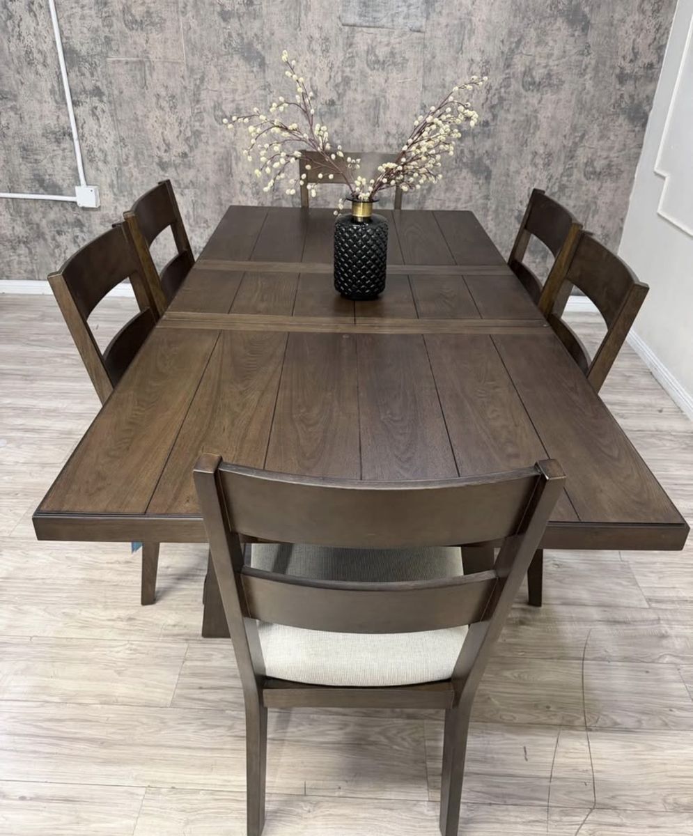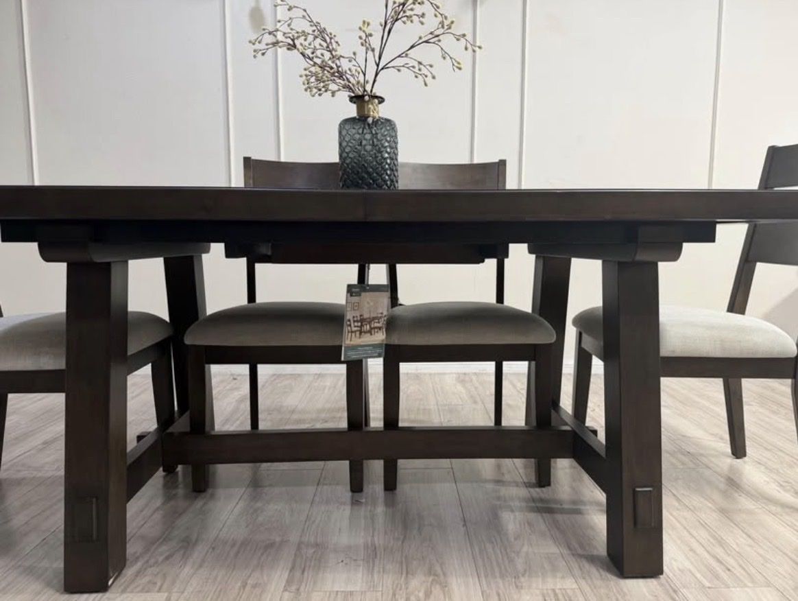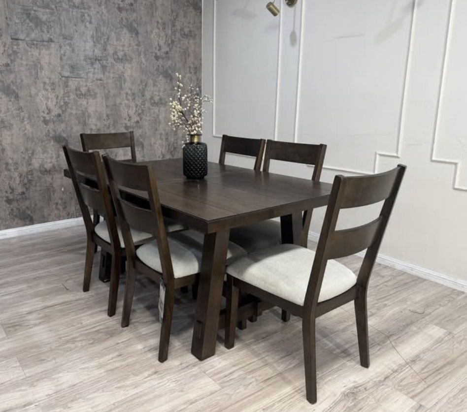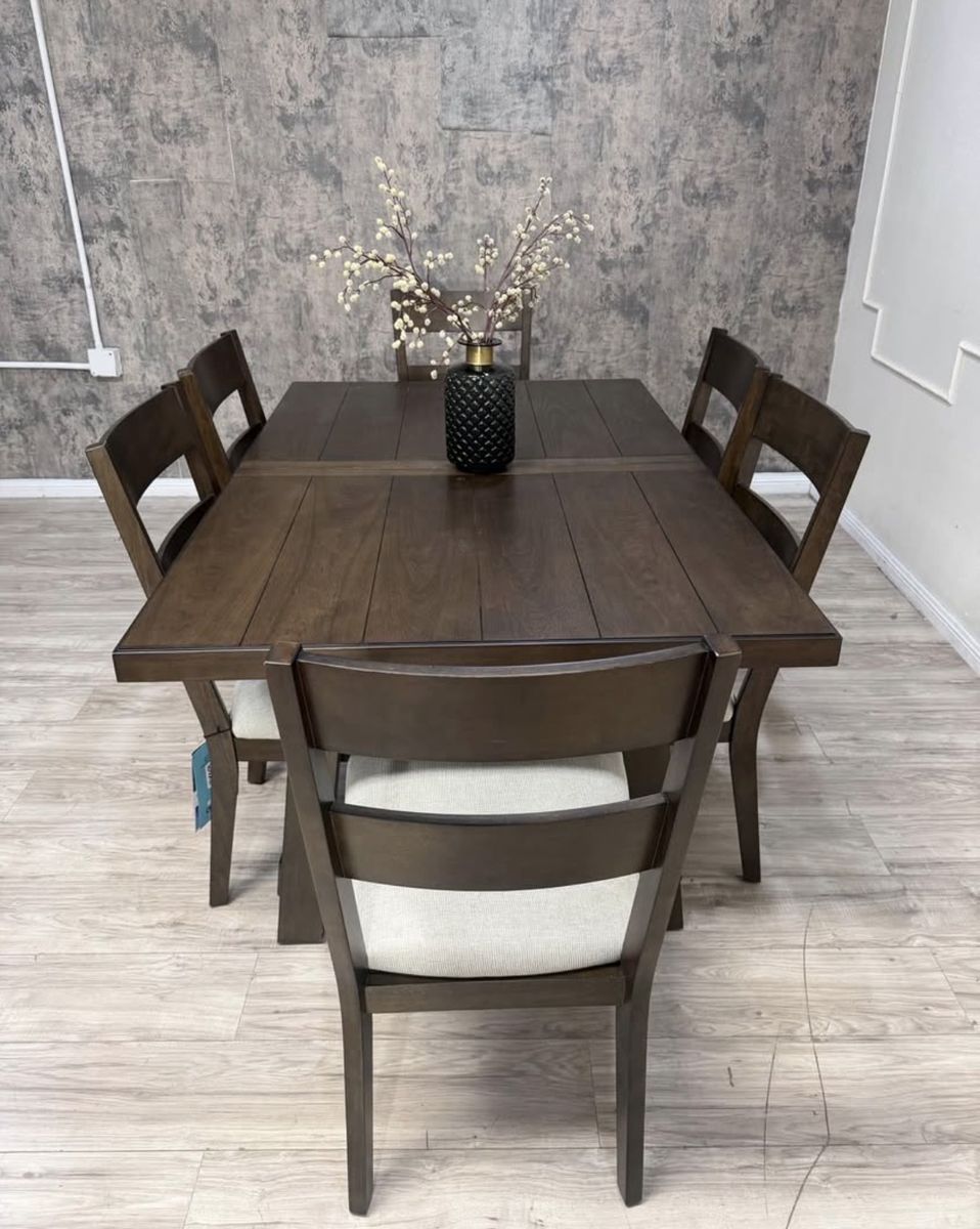 Rich, rustic and always ready for a dinner party, the Brinley 7-Piece Dining Set is farmhouse styling at its finest. Whether a more intimate gathering for a few, or everyday family meal time, six chairs and a self-storing leaf easily make room for more. Richly textured ash veneers, stylish fabric upholstery with comfy foam seat cushions, and solid rubberwood construction, make the Brinley a welcome addition to any home.