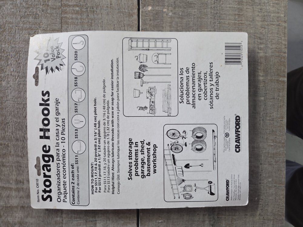 10 piece set of Stoage Hooks for garages and sheds. Moved and have no place to use them.