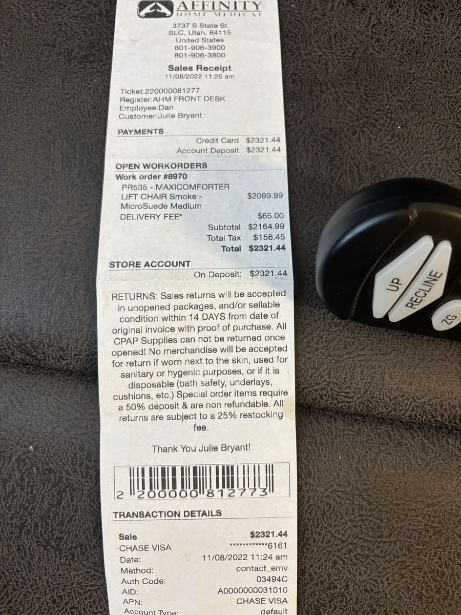 VenmoMy mother’s recliner, now for your mother, granny, or modestly sized granddad. It’s a medium, so it was a special order; all the ones in the showroom at Affinity Home Medical were large or XL. It was perfect for a range of body types – it was very comfortable for me (5’8”, 180lbs) and my mom (5’0”, 100lbs). (You’d want to look at a larger size for anyone much bigger, but it was perfect for my diminutive mama.)