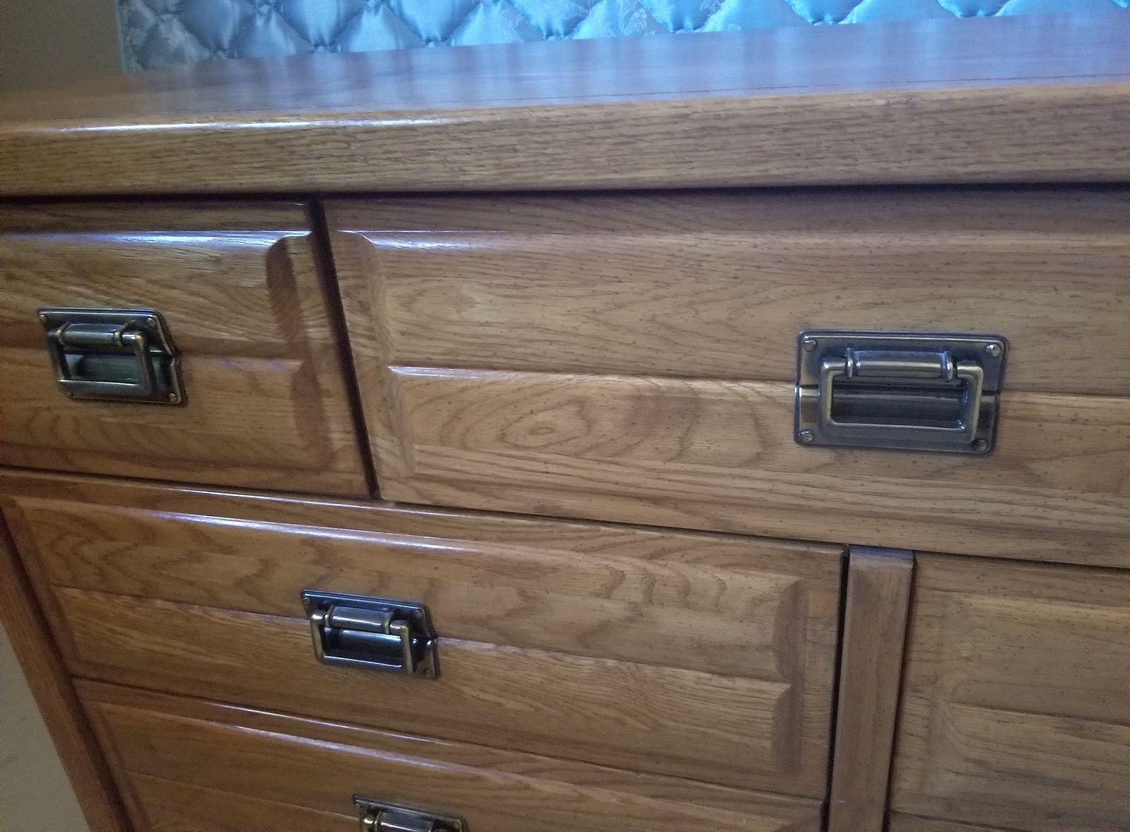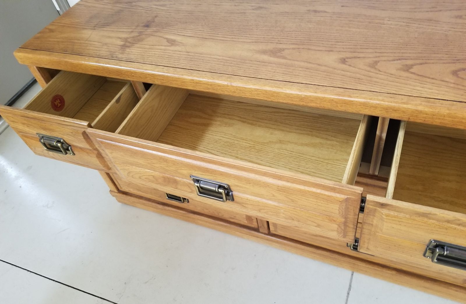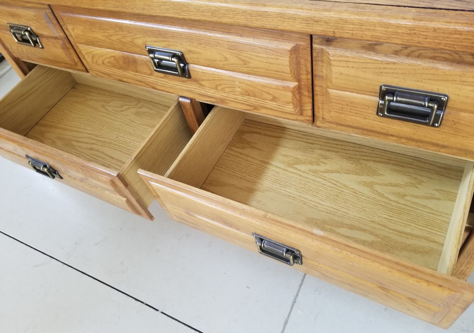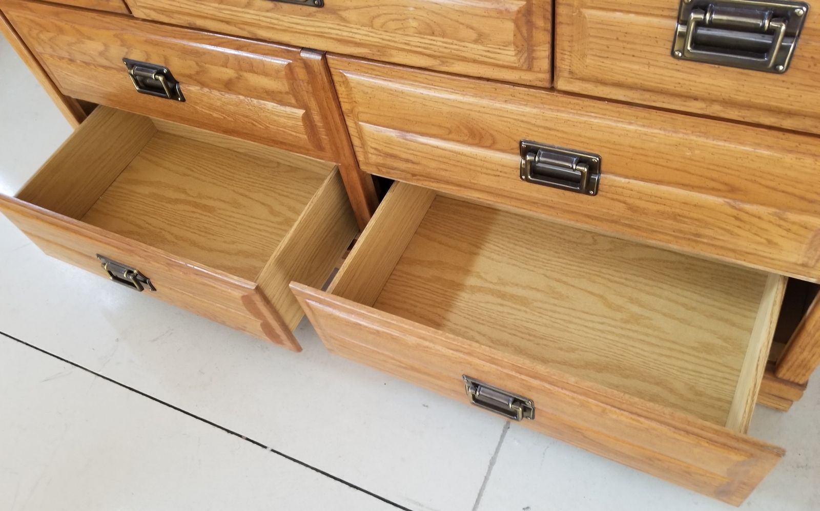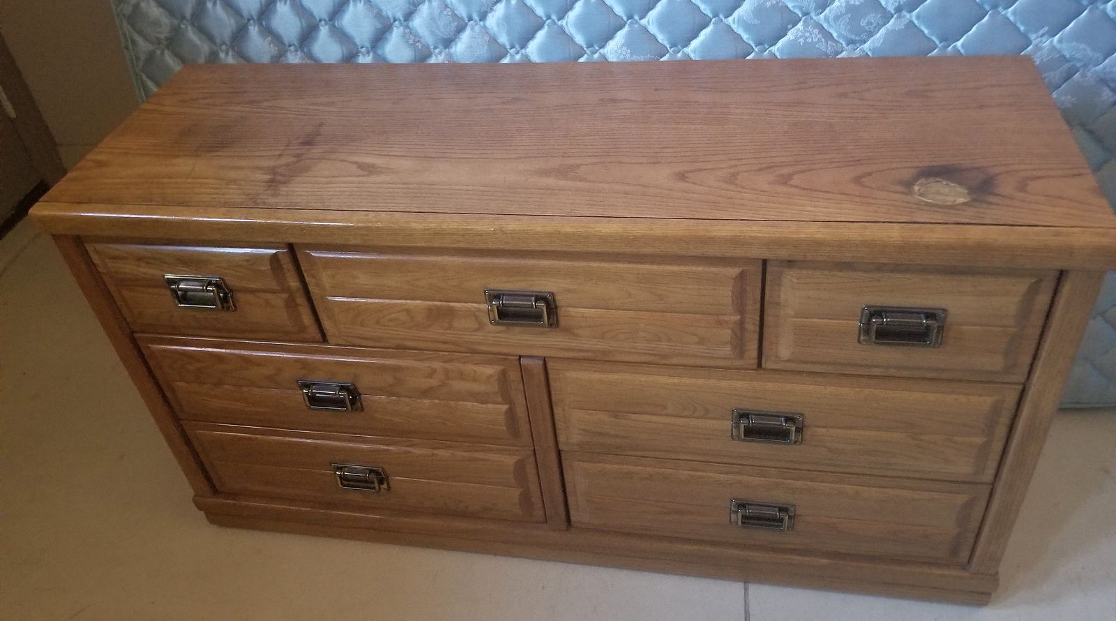 7 drawers (3 small top row, 2 rows of 2 large below) Solid construction (not flimsy particleboard) All drawers open and close properly Clean inside and out Warm wood tone works with most styles