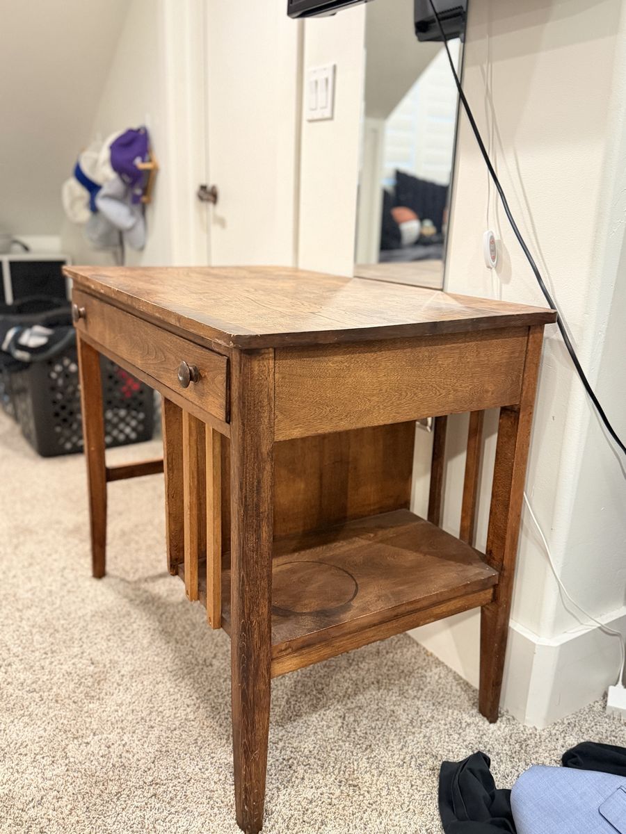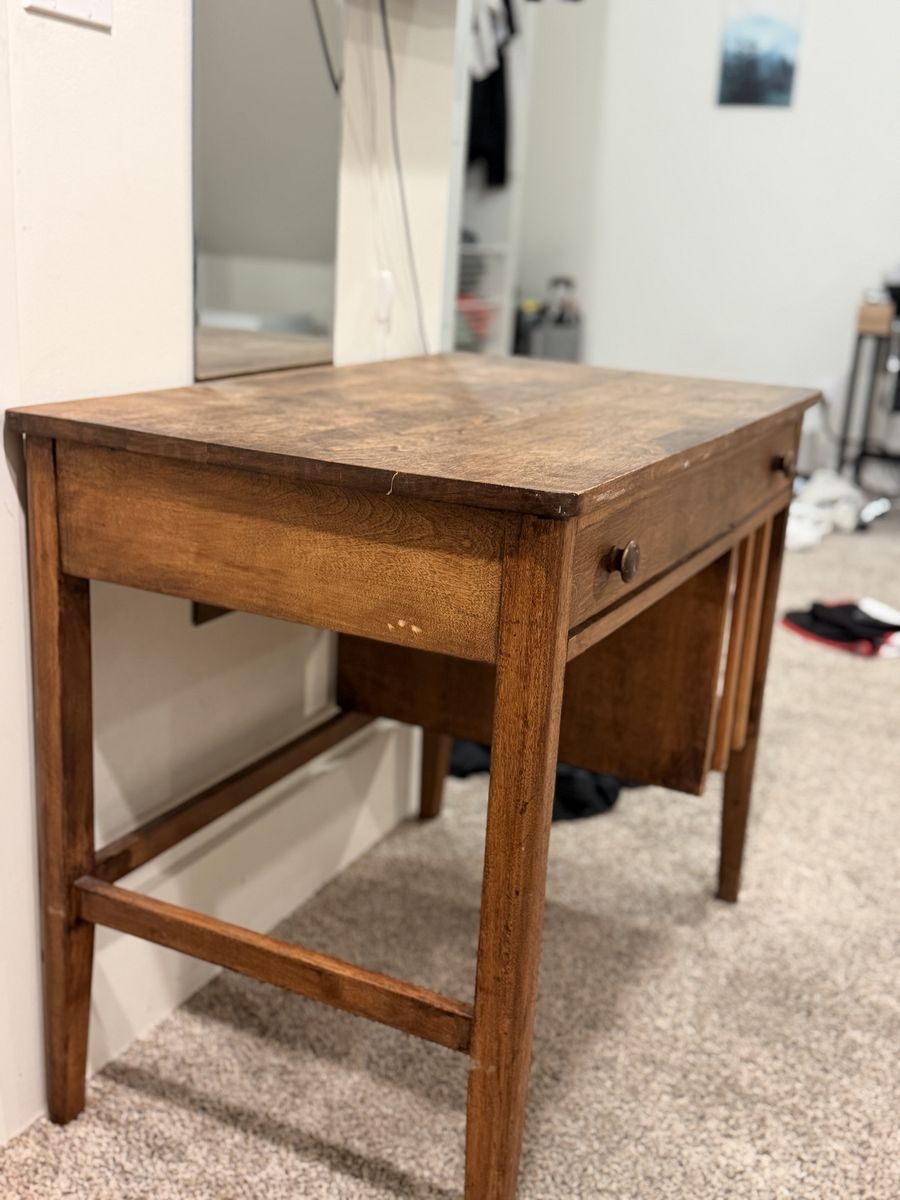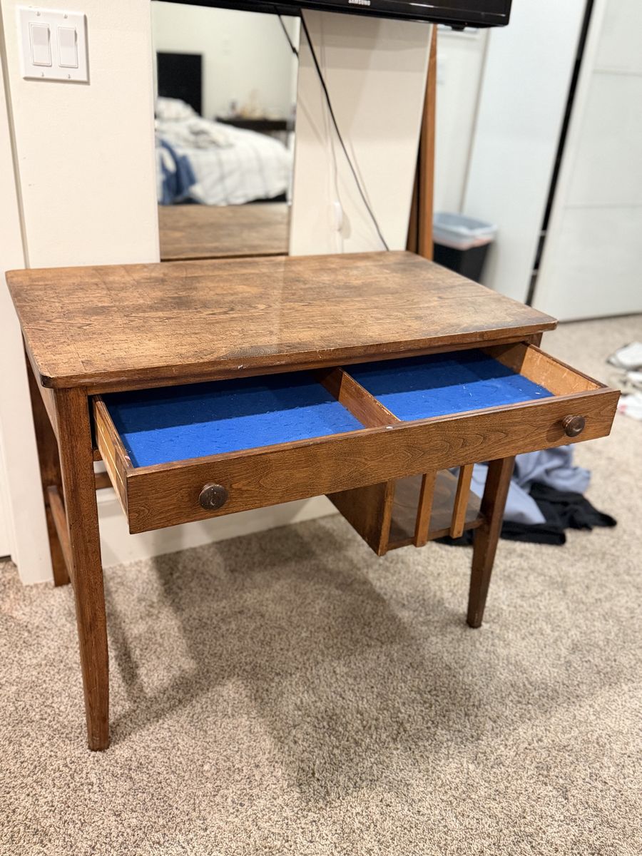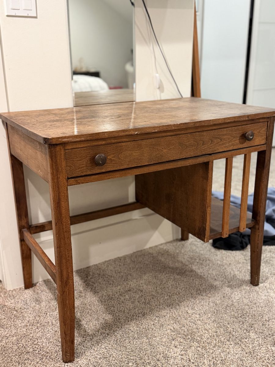 It's a great, functional, used old wooden desk with a chair. The chair does squeak slightly when leaning back, but it's still pretty sturdy and usable.