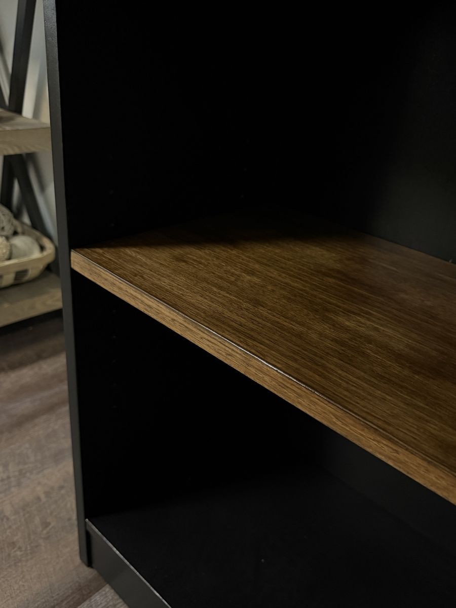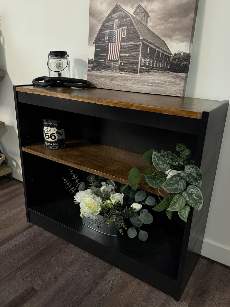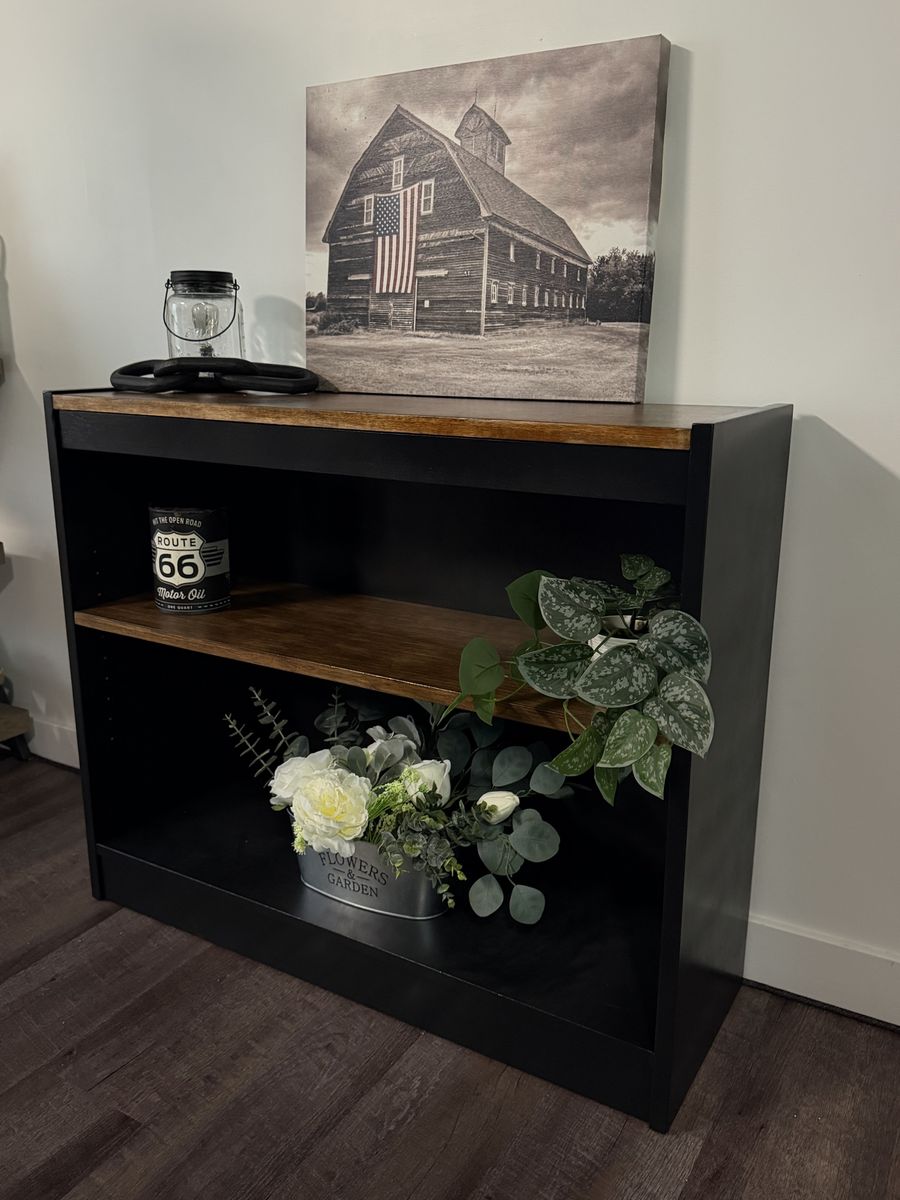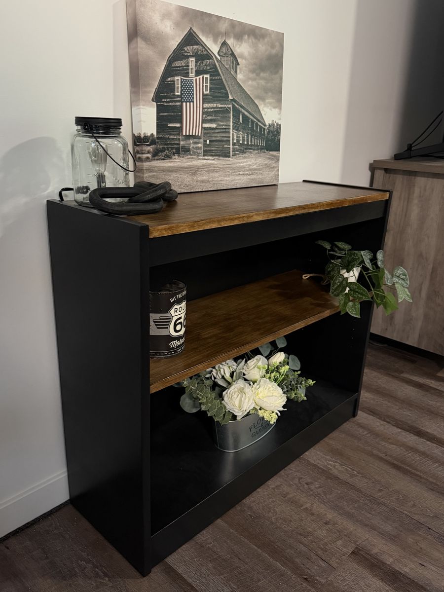 VenmoModern rustic 2-tier console shelf with a rich wood top and middle shelf with a sleek black frame for a high-end look. Features an adjustable middle shelf for flexible storage—perfect for books, decor, or baskets. Great for a living room, entryway, or console table.