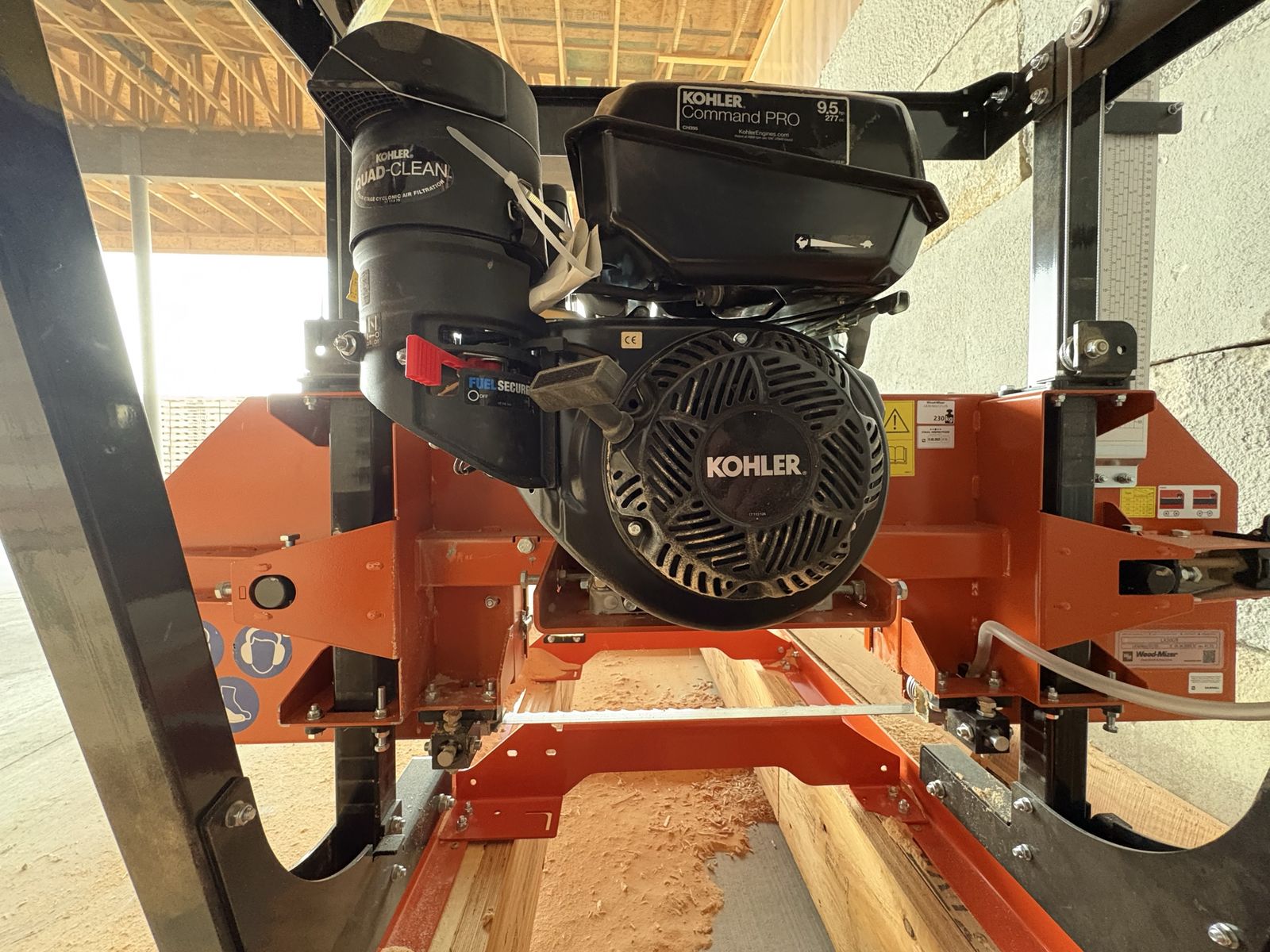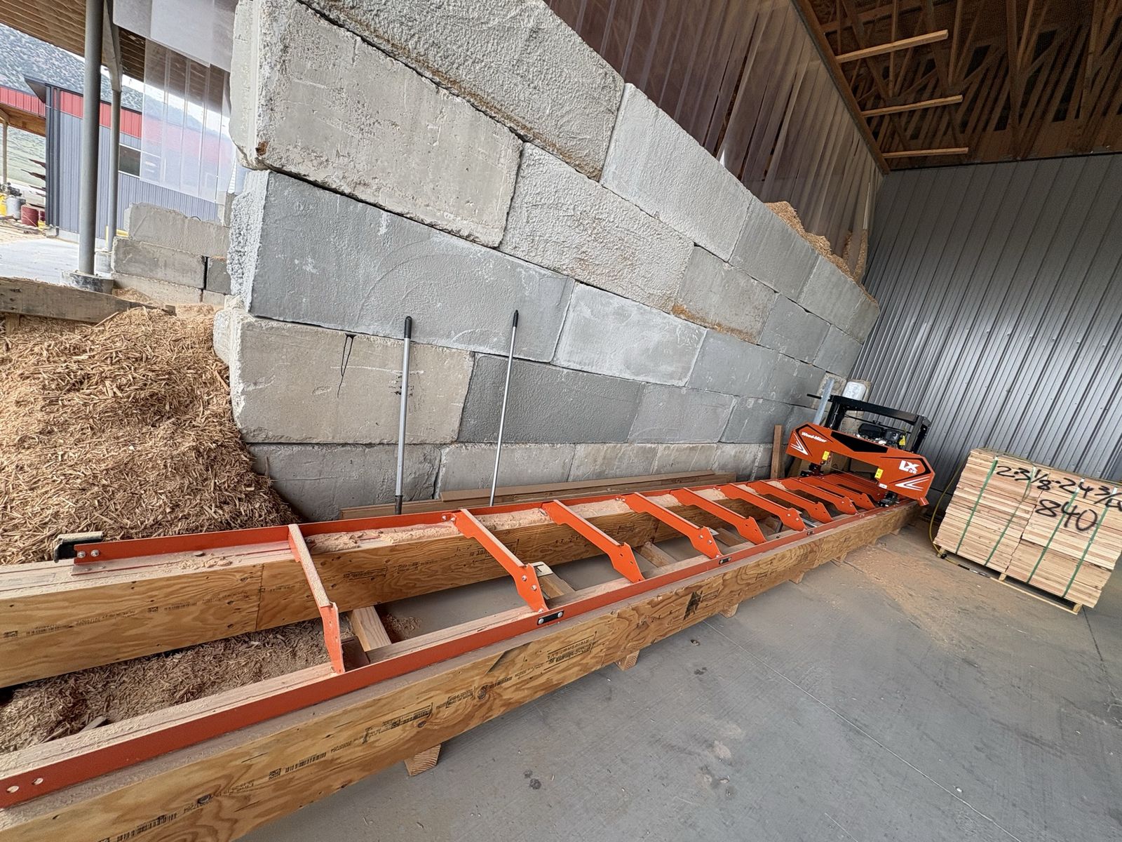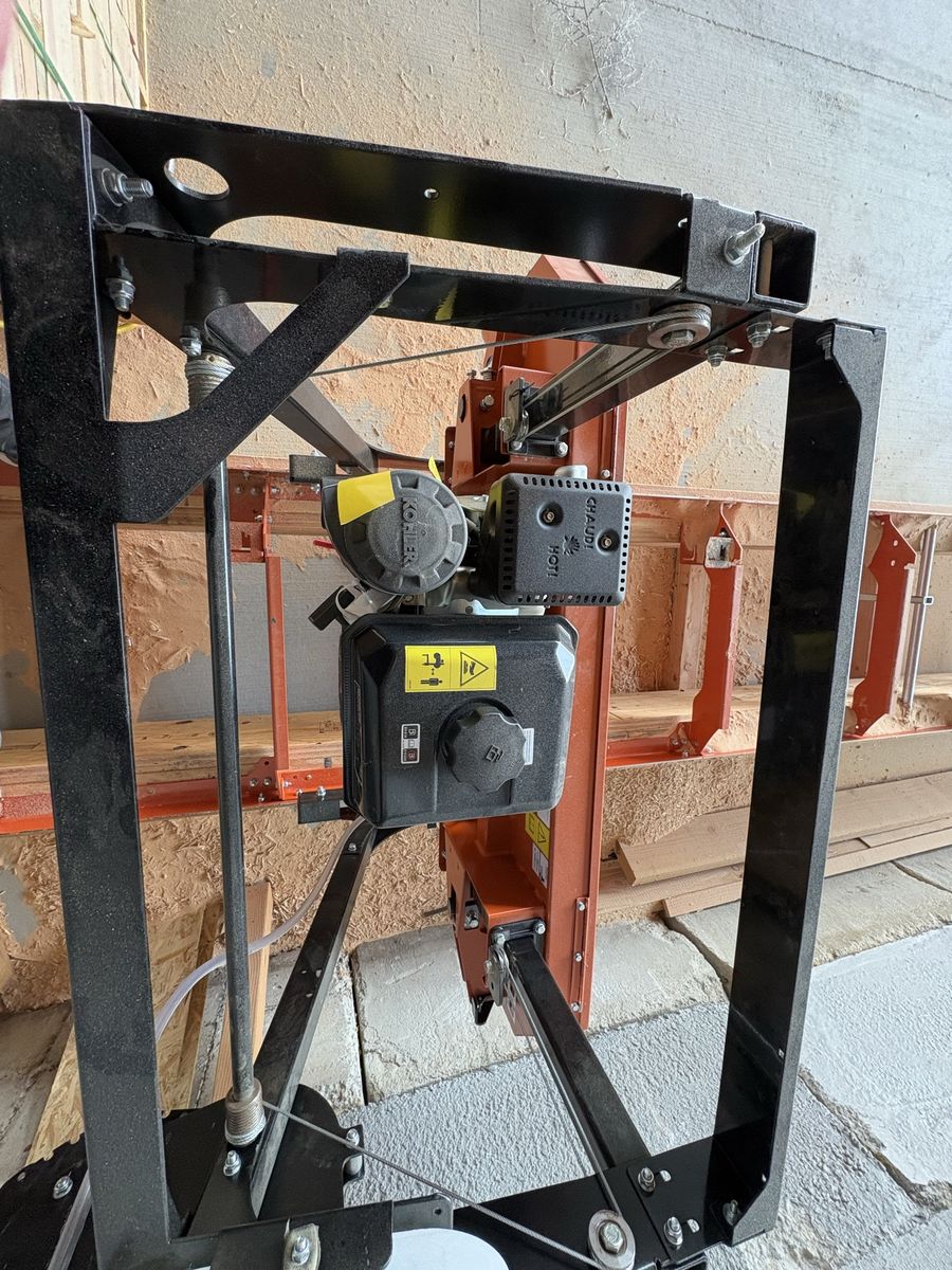 LX30 gas powered Woodmizer bandsaw. Only used a few times. 26’ of travel on an extended track. Elevated platform underneath for stability of track.