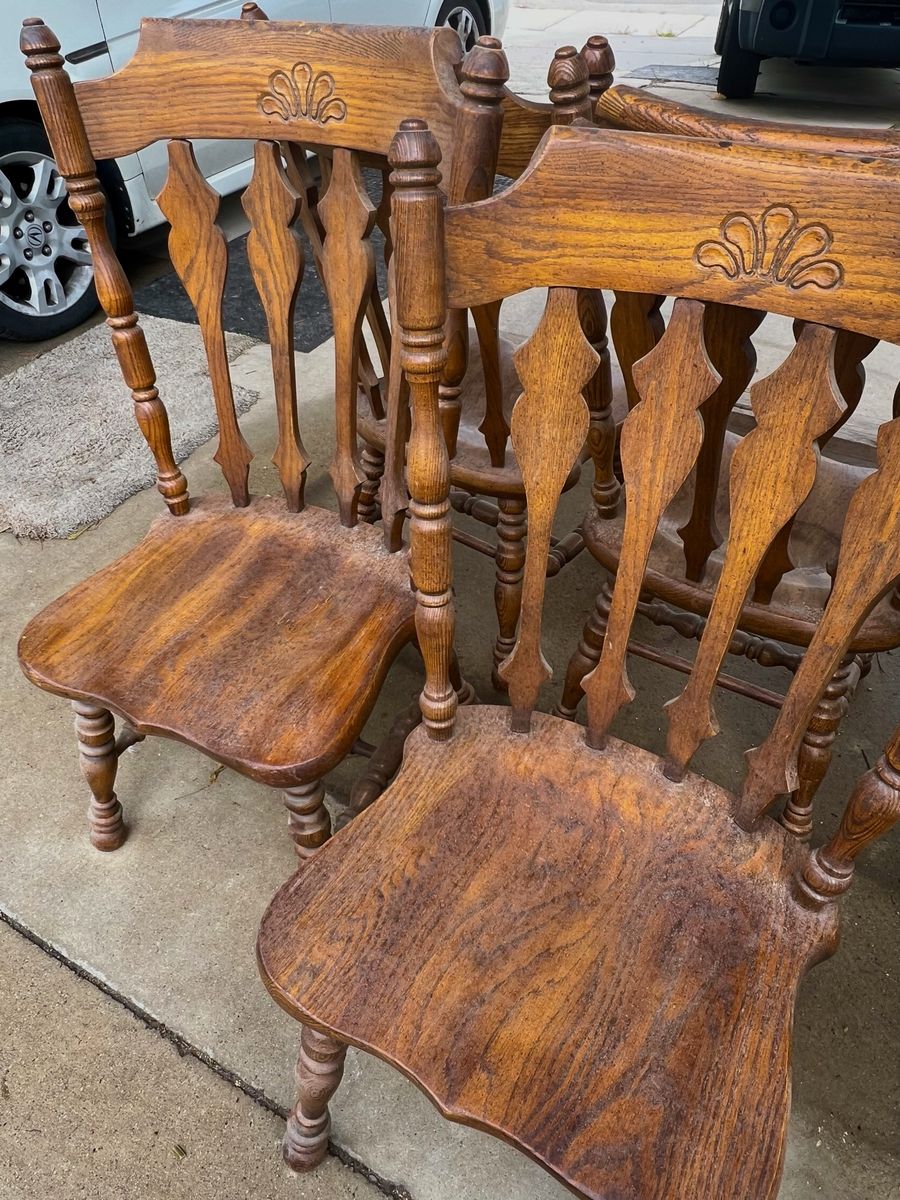 Dining table with 1 armchair and 5 armless chairs. Includes 2 leaves to extend. Structurally solid, good overall condition.