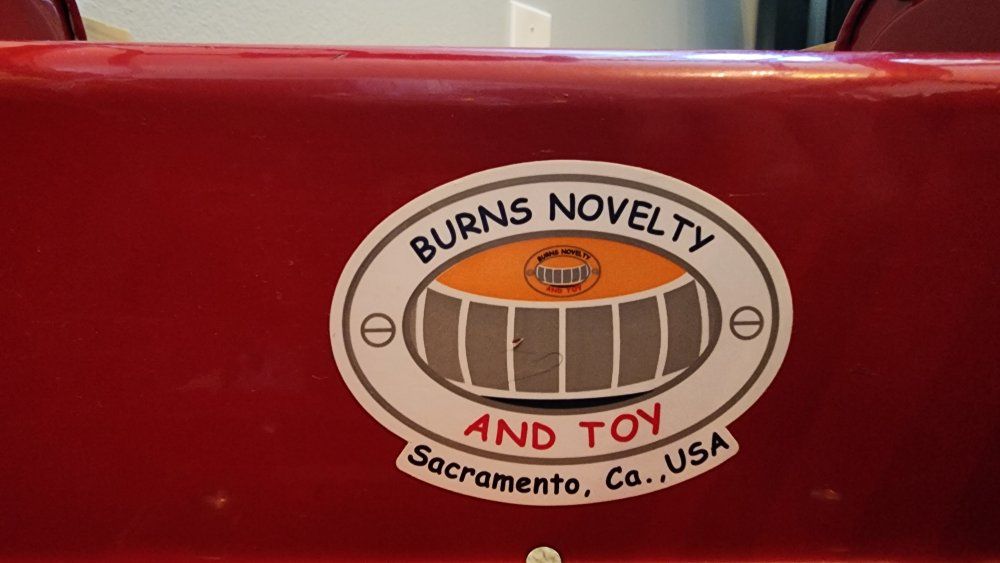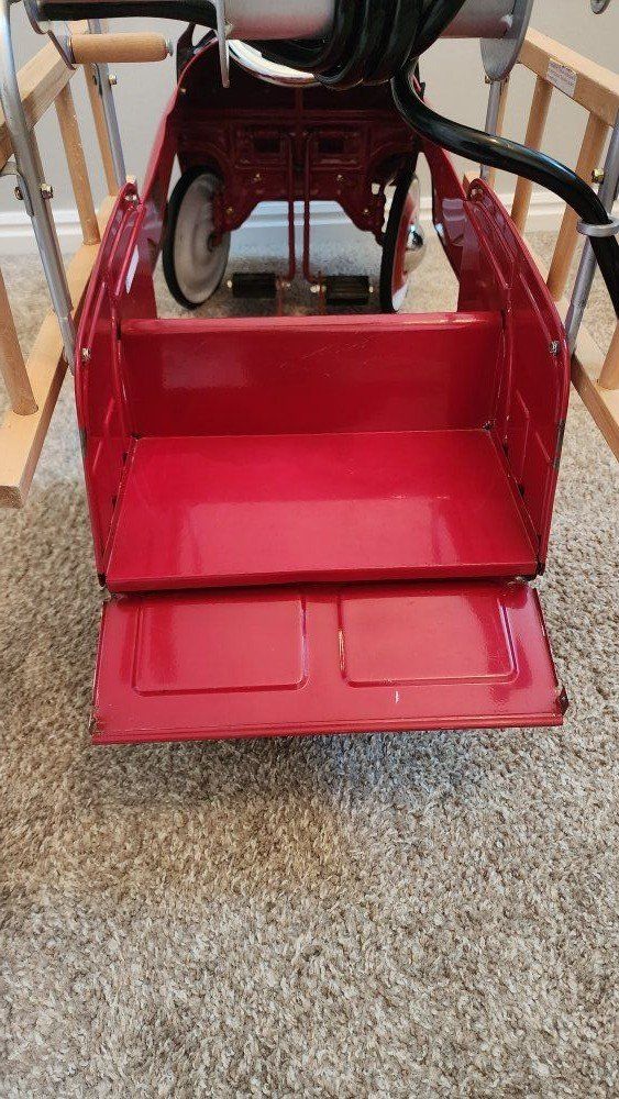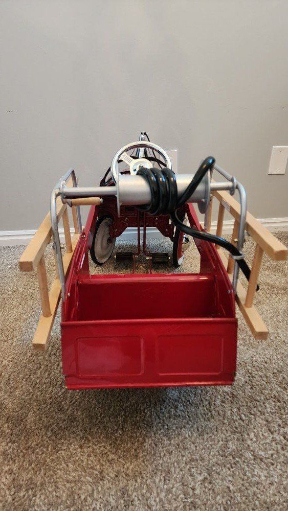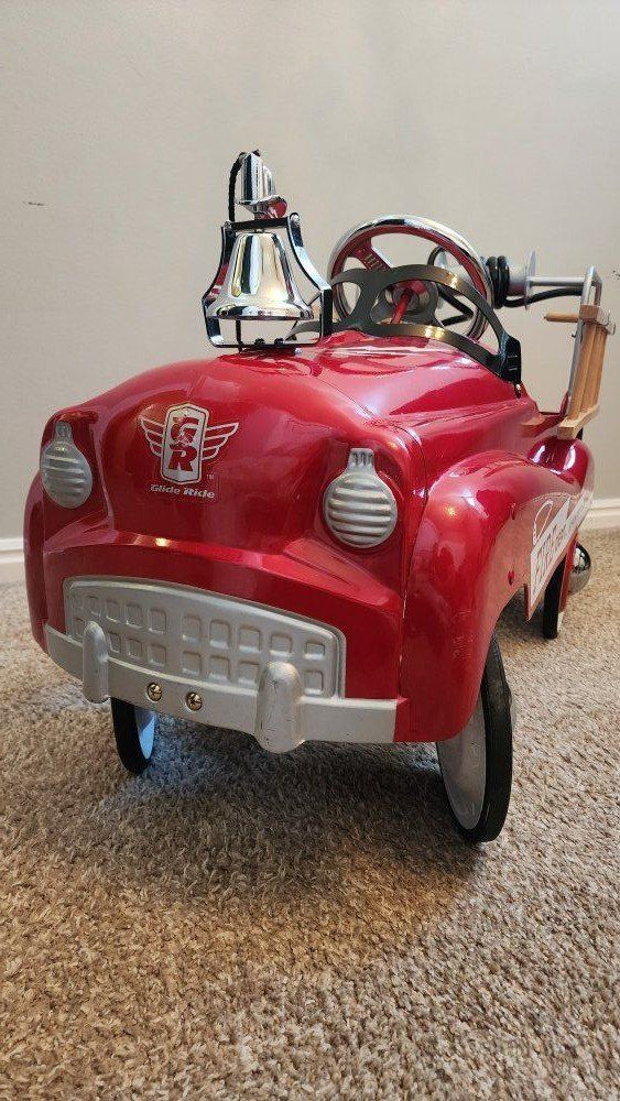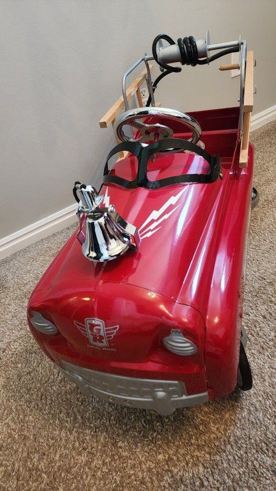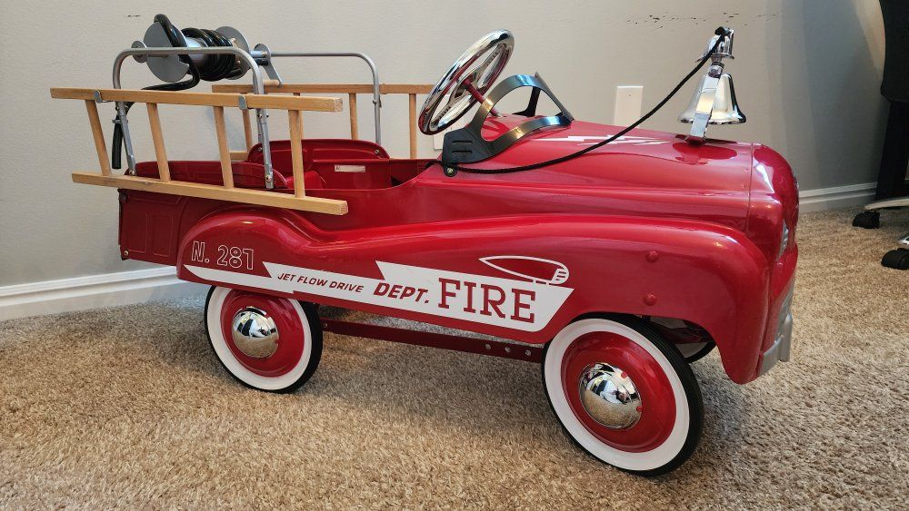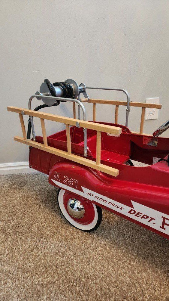 VenmoThe Burns Novelty Company Pedal Fire Truck N 281 Jet Flow by Gearbox is a vintage collectible toy vehicle made of metal in a vibrant red color.