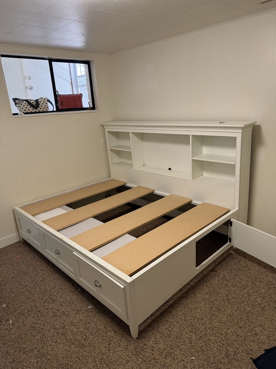 VenmoFull size bed frame in fair condition. Has lots of storage underneath the bed and in the drawers/shelfs. Has a small amount of damage. Is fully disassembled and ready to be picked up.