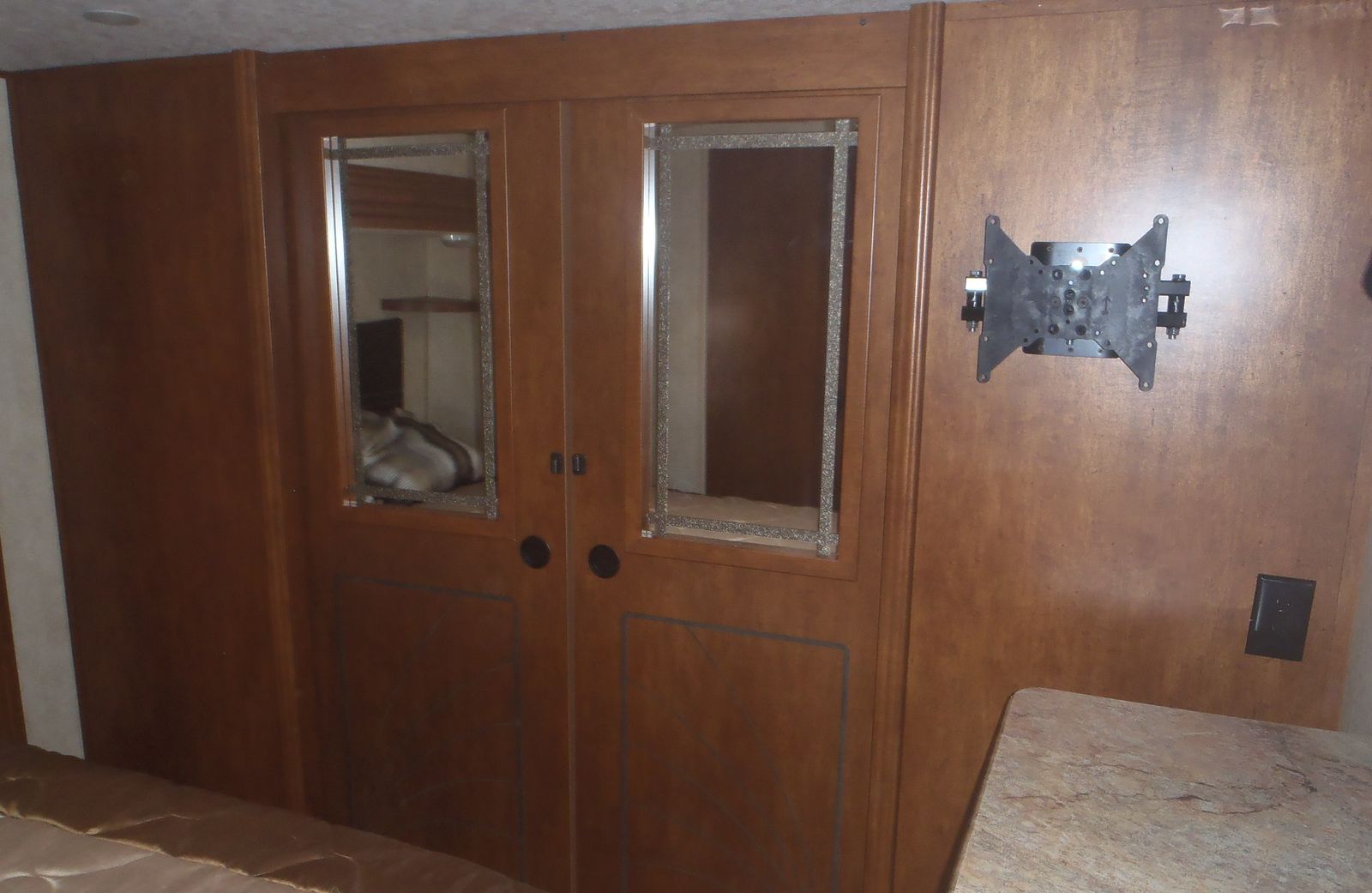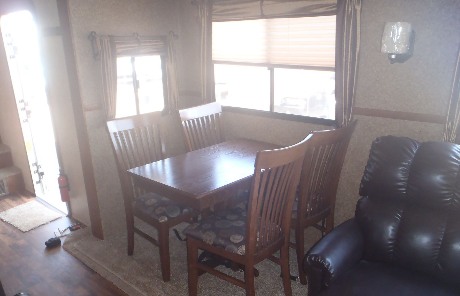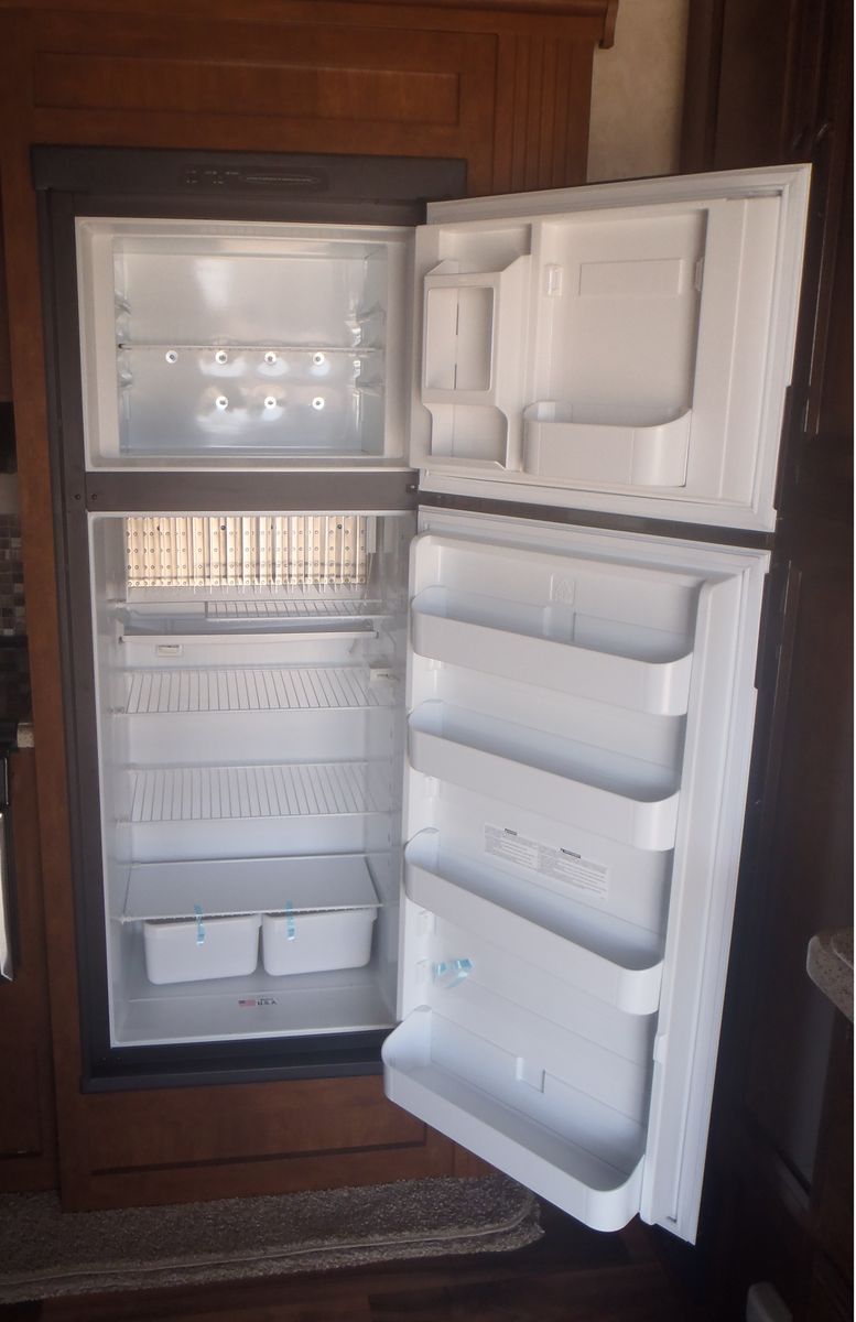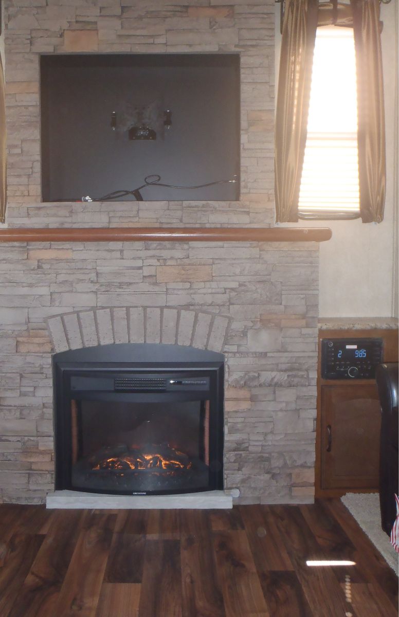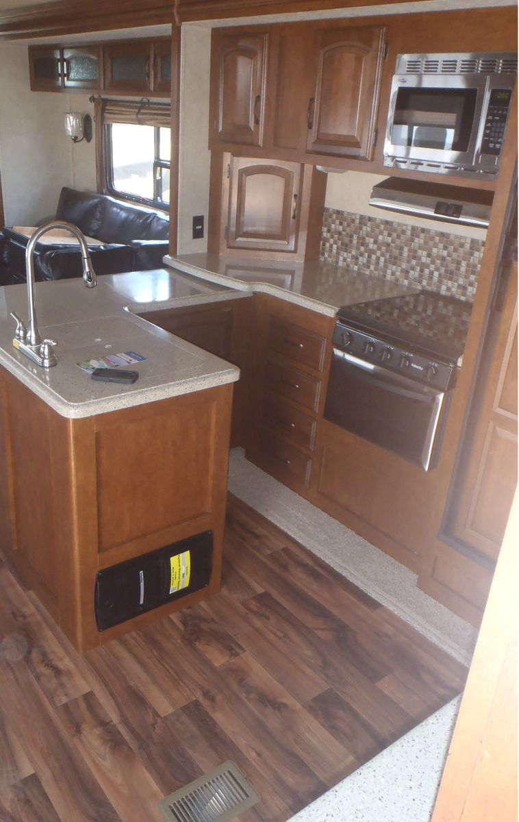 2015 Forest River Heritage Glen 327RES, triple slide fifth wheel, features front full queen bed, full closet across the front with washer/dryer hookups, dresser at foot of bed, bathroom with neo angle shower, L shaped kitchen with solid surface countertops and large pantry, rear entertainment center with TV above fireplace, ceiling fan, LED lights throughout, ducted 15K BTU A/C, non-ducted 13.5K BTU A/C in bedroom with heat strip, 150W roof mounted solar panel, power awning w/LED lights, 3 slide toppers, 3 window awnings, 8cuft gas/electric refrigerator, microwave, 10 gallon gas/electric DSI water heater, central vacuum system, power landing gear, power rear stabilizer jacks, Goodyear Endurance tires on aluminum wheels and more. Dry weight 10209, GVWR 12195, sleeps 4. Stored indoors.