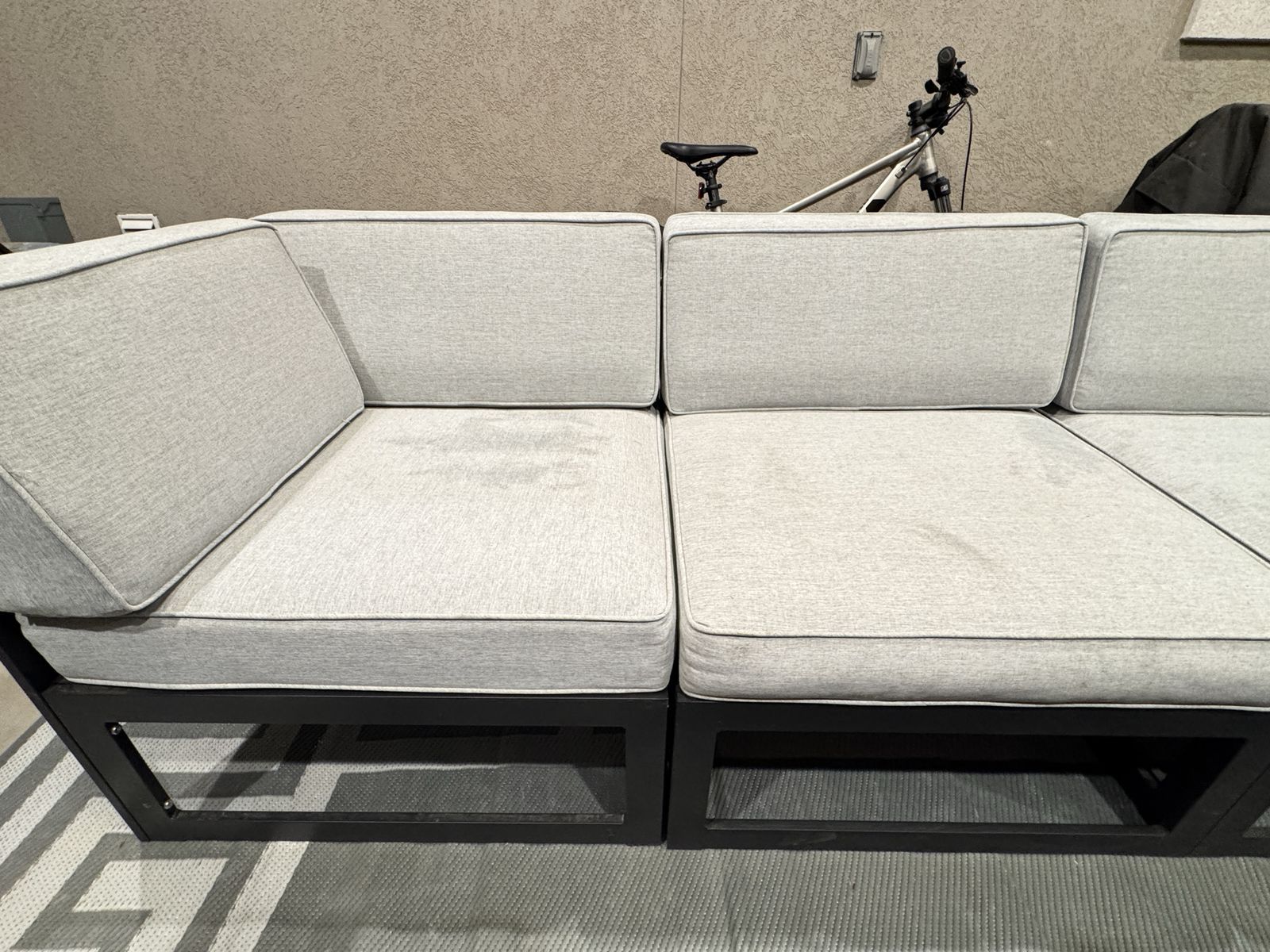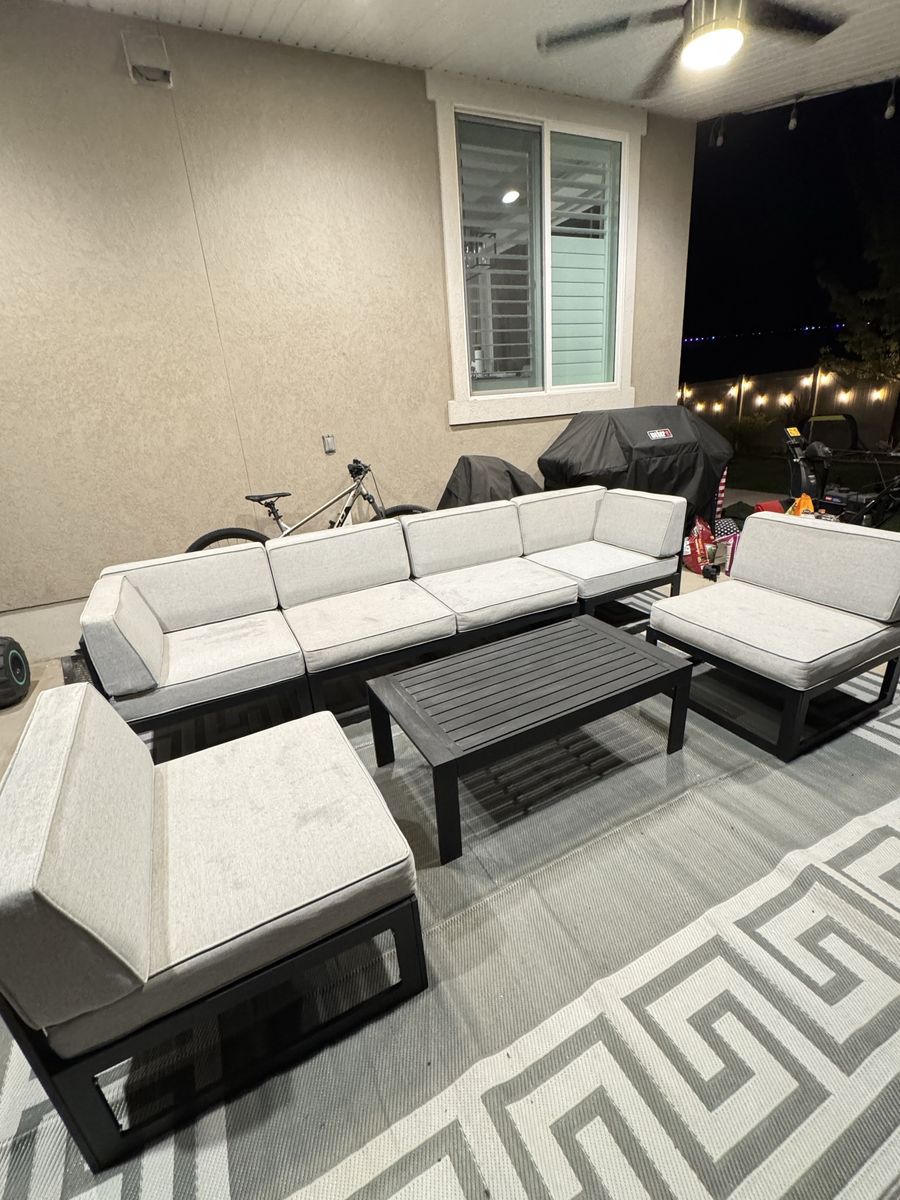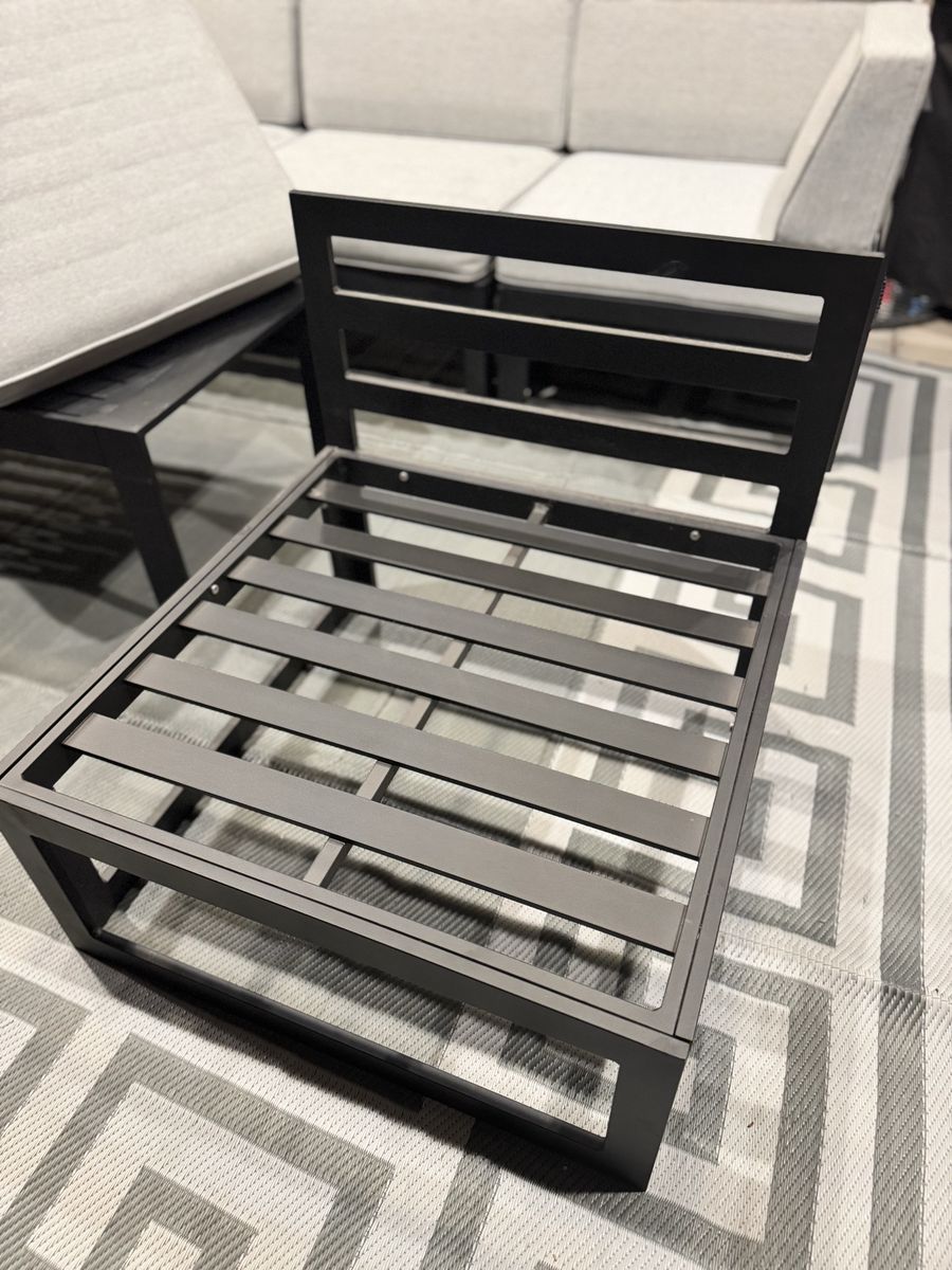 Slightly used, bought less than a year ago, in great condition, super light weight but really sturdy, aluminum frame with removable cushions! comes with a matching table and can move around however fits your style, We have just decided to do something different with our space and don’t have room for this furniture. Bought for over 1100$. Our loss your gain! ONLY SERIOUS BUYERS No trade, firm on price! Thanks for looking
