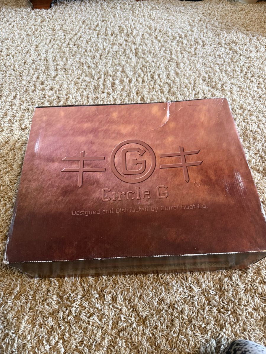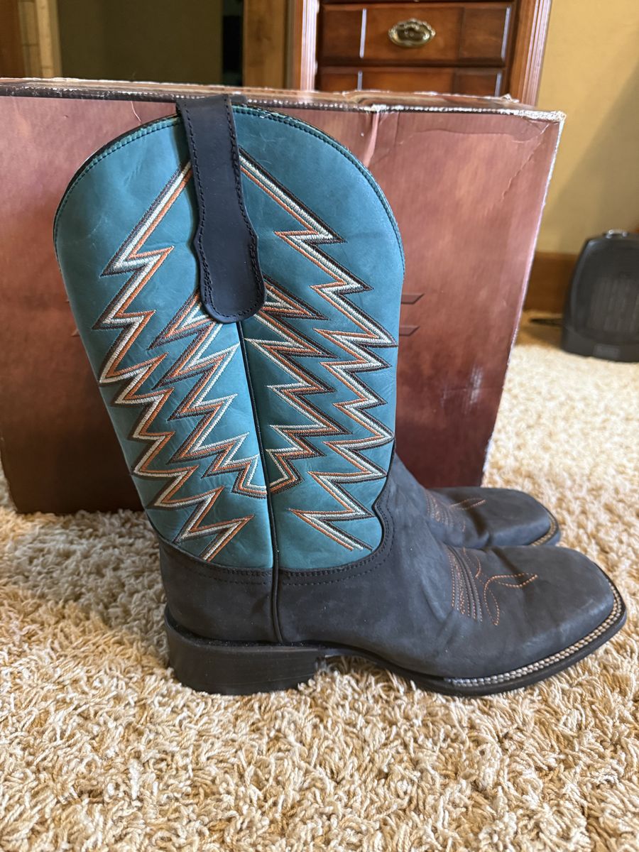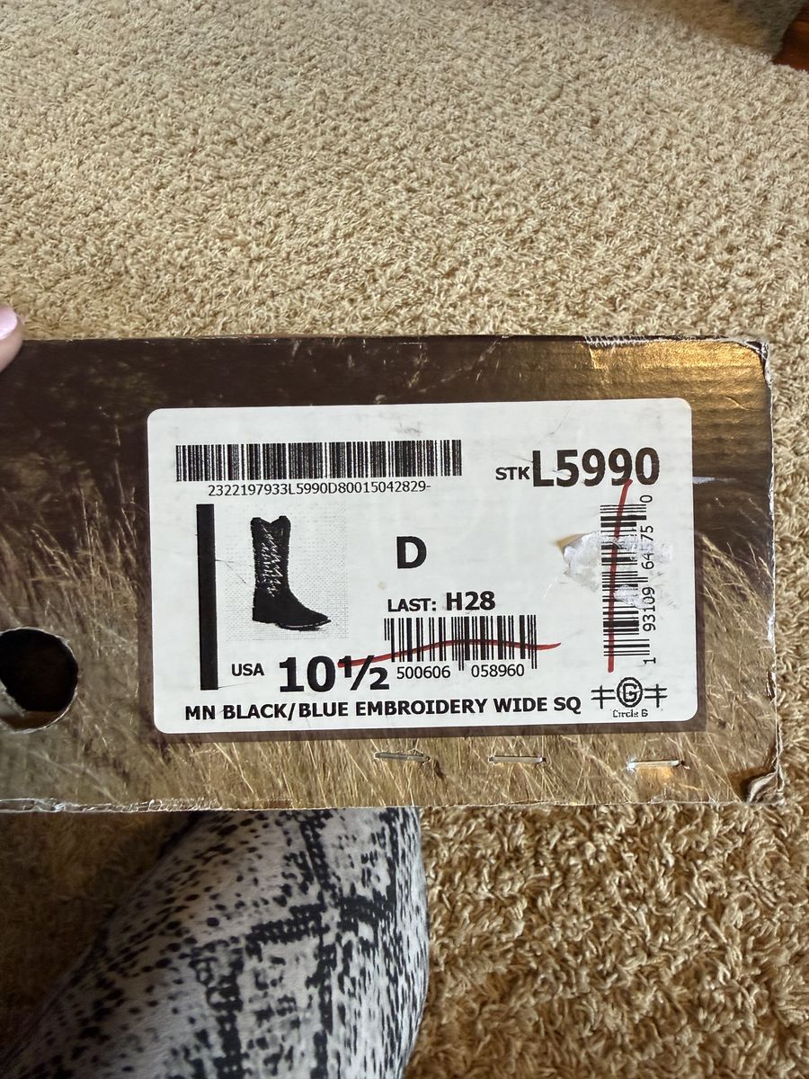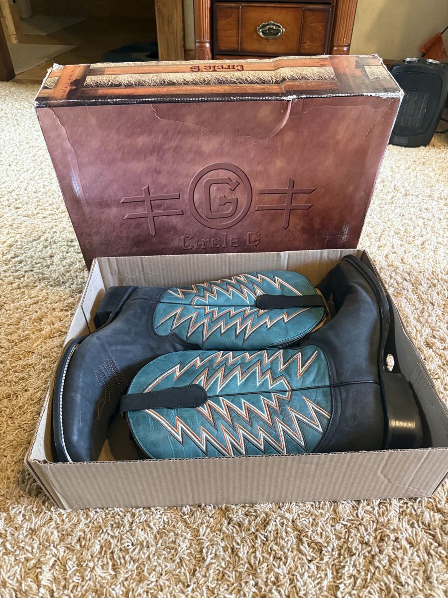 VenmoBrand new pair of men’s circle G cowboy boots. These are the black and blue embroidery wide square toe. Size 10.5