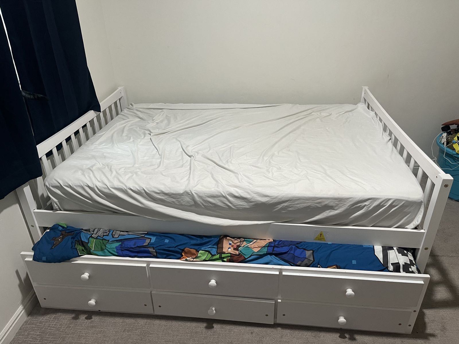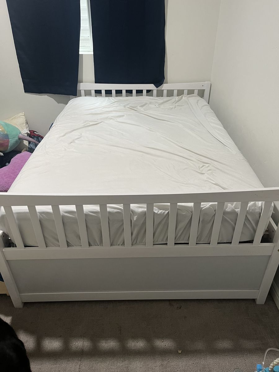 ApplePayFull size trundle bed over a twin size pull out with 3 storage drawers. This bed is pretty new and heavy duty, it's been perfect we are just moving and it won't work in the new place.