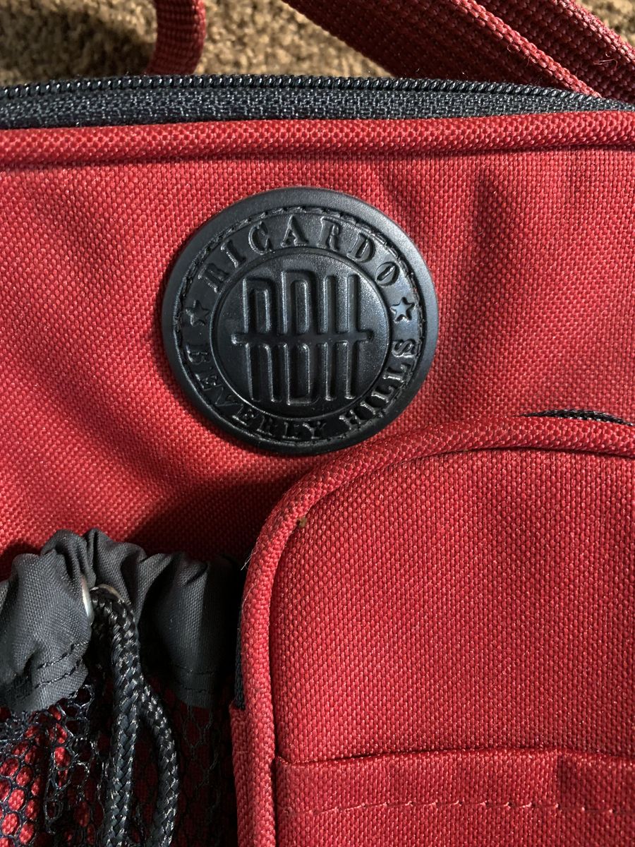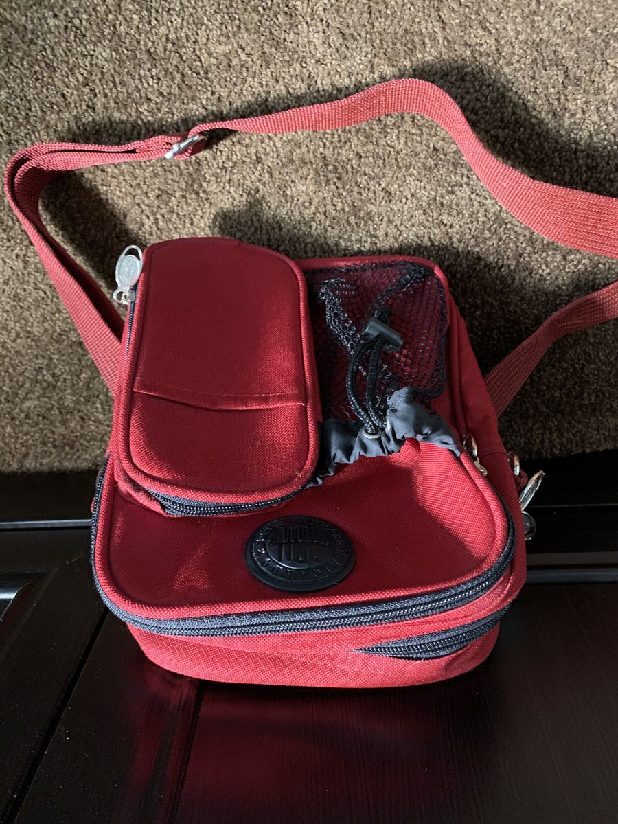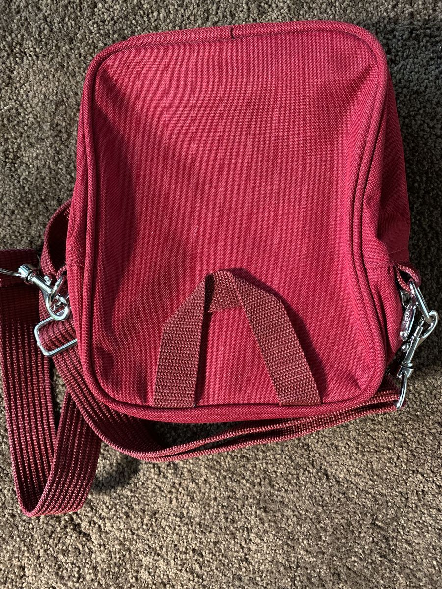 This is a Ricardo Beverly Hills Red Canvas Travel Bag Shoulder/Crossbody Adjustable Strap with Zip Closure and Two Zip Compartments. It can fit a water bottle in the front pouch. Perfect for vacations!