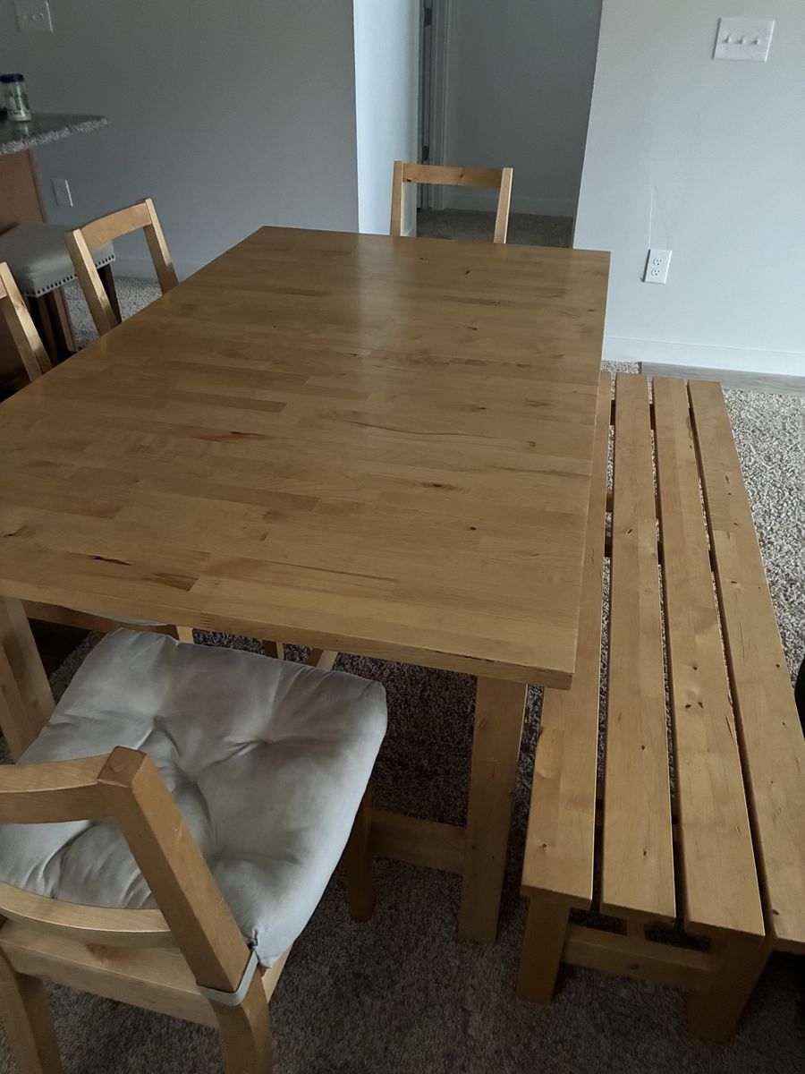 VenmoExtendable dining set with 4 chairs and bench. 58 3/4 x 35 1/4 x 29. Extendable piece adds additional 21 1/2 inches to length with easy access and storage underneath table top. Table mostly unused. Open to serious offers.
