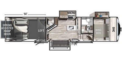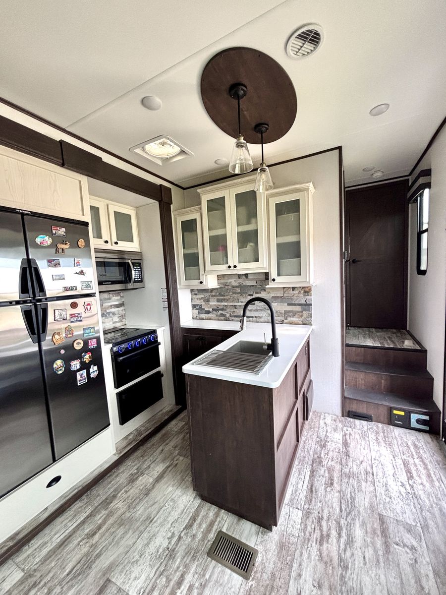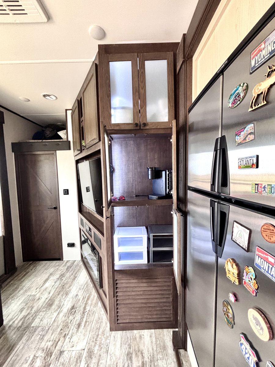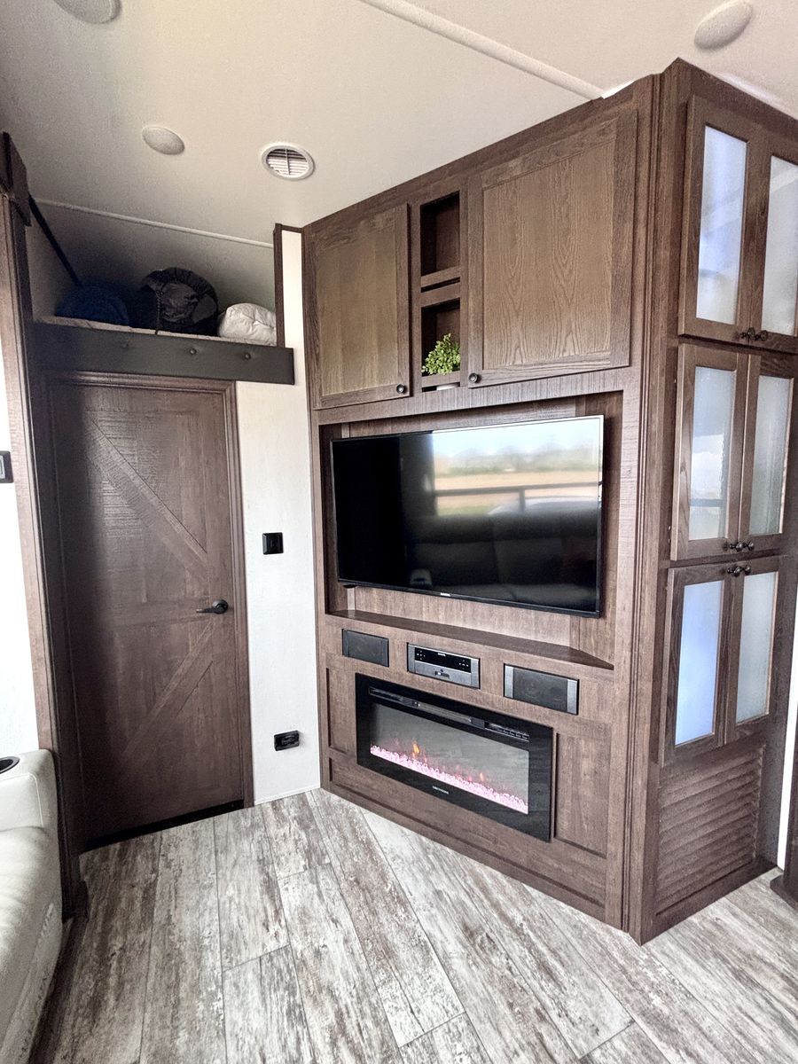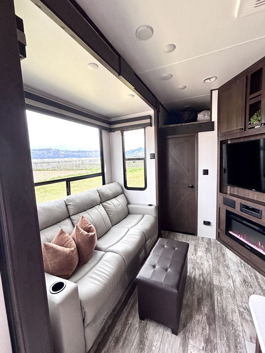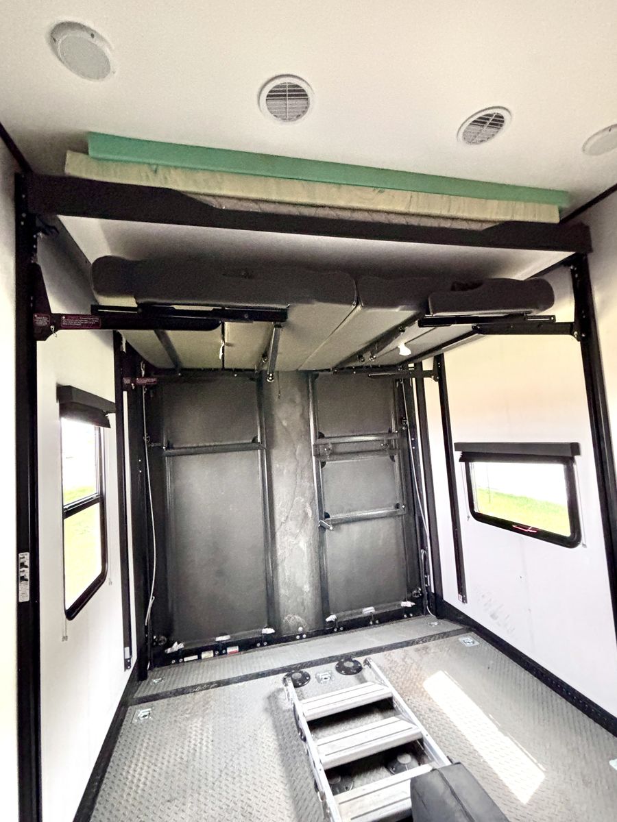 40' overall length, 14' garage (fits my four seat turbo S with extra room), Auto-level system, dual A/C, fireplace with timer (can be used as extra heating source), 3 slide outs (kitchen, living room & bedroom), couch has 3 recliners, internal loft for extra sleeping, tons of cabinet space, king bed with upgraded mattress (entire bed is storage), central vacuum, dual queen beds in garage, rear patio set up, garage 1/2 bath, washer/dryer connections