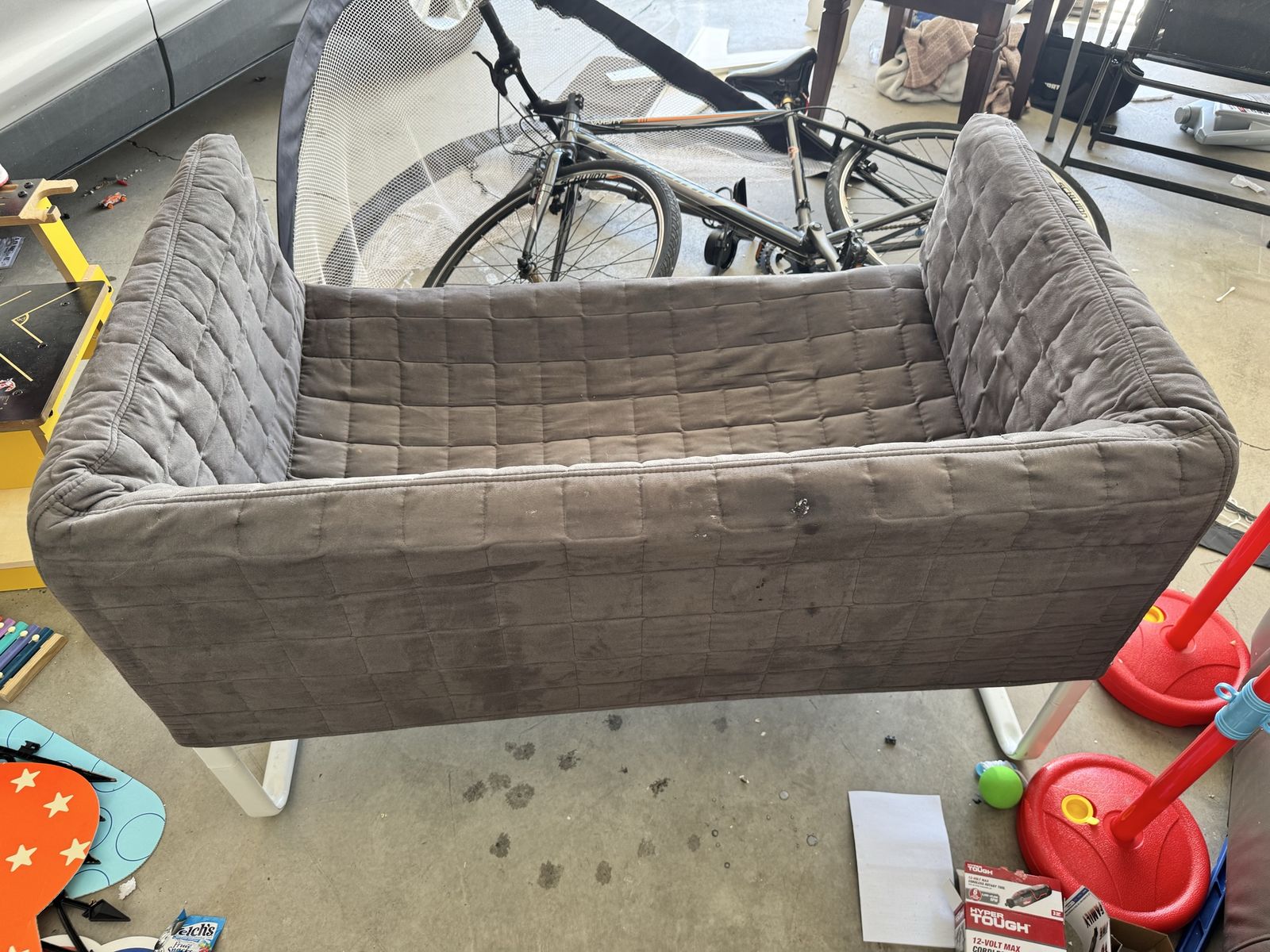 ApplePayQuilted gray loveseat. Has a cool textured design and white V-shaped legs. Compact size. Been perfect for my toddlers, no animal household. Been sitting in the garage for about a year. The quilt comes off for easy washing.