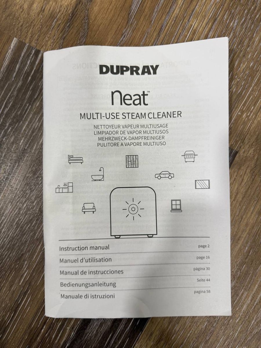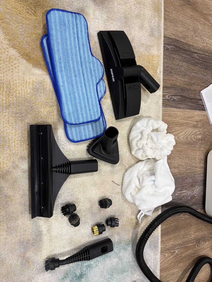 Used Dupray Neat multi-use steam cleaner with hose, manual, floor pads, brushes, nozzles, and cleaning attachments shown in photos. Good for floors, tile, grout, bathrooms, kitchens, upholstery, cars, windows, and general steam cleaning. Normal cosmetic wear from use. Functionality not fully tested, selling as-is. Cash or Venmo accepted. Pickup in Lehi.