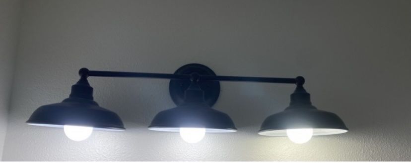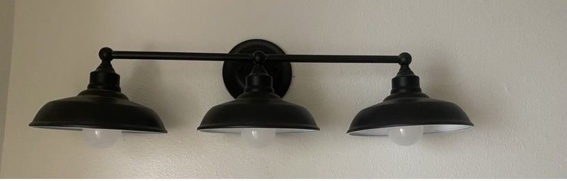 Bathroom Vanity Triple Farmhouse Wall Sconce Light with Black Matte Metal Shades, in great like new condition, Smoke free home.