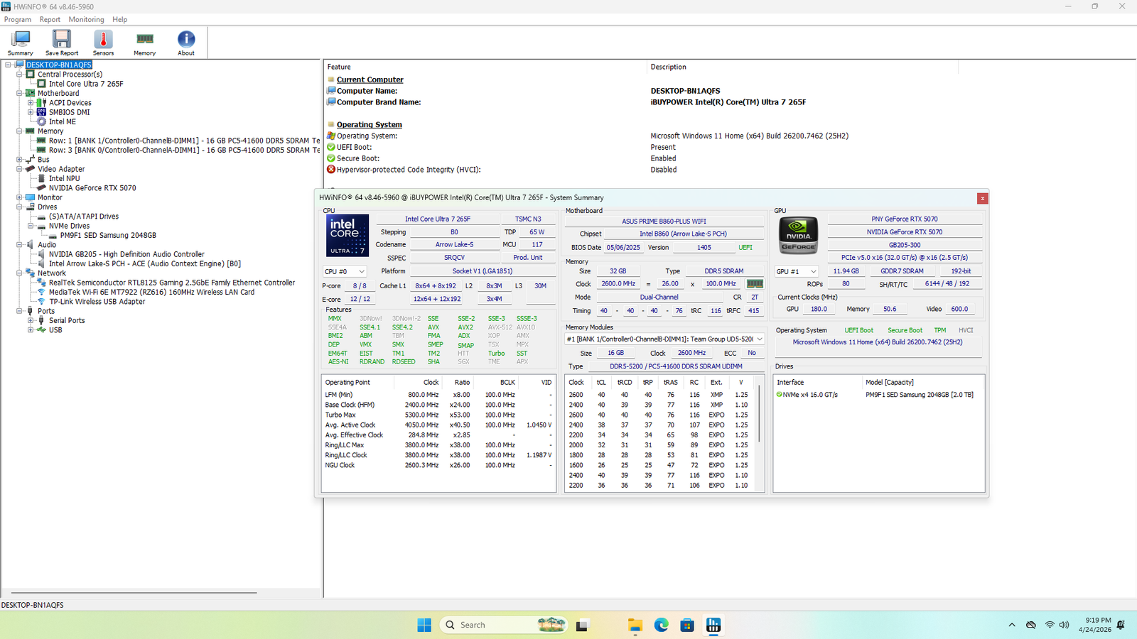 Storage: 2TB Samsung PM9F1 NVMe SSD (Health: 100%, Only 212 hours of use)