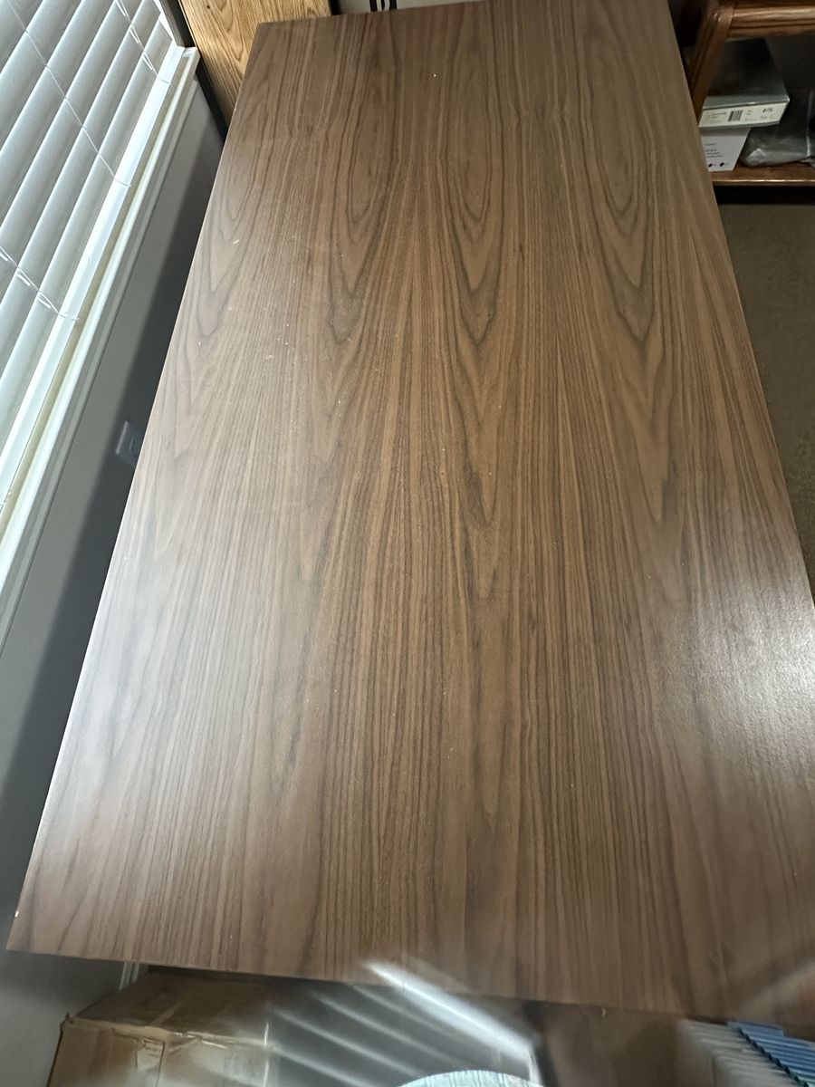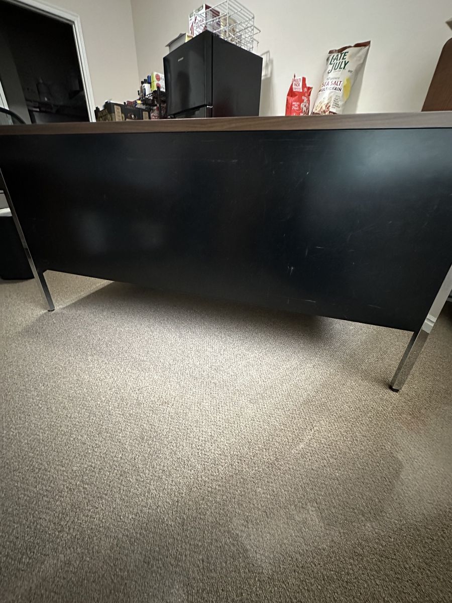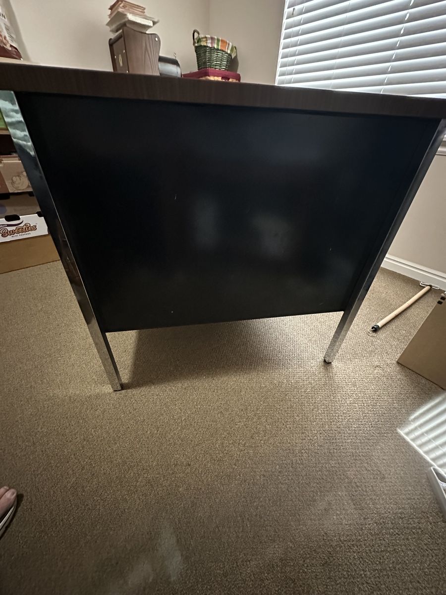 This nice desk is black with a dark brown top. It has six large drawers including a file drawer. The dimensions are 60" x 30" x 29"H.