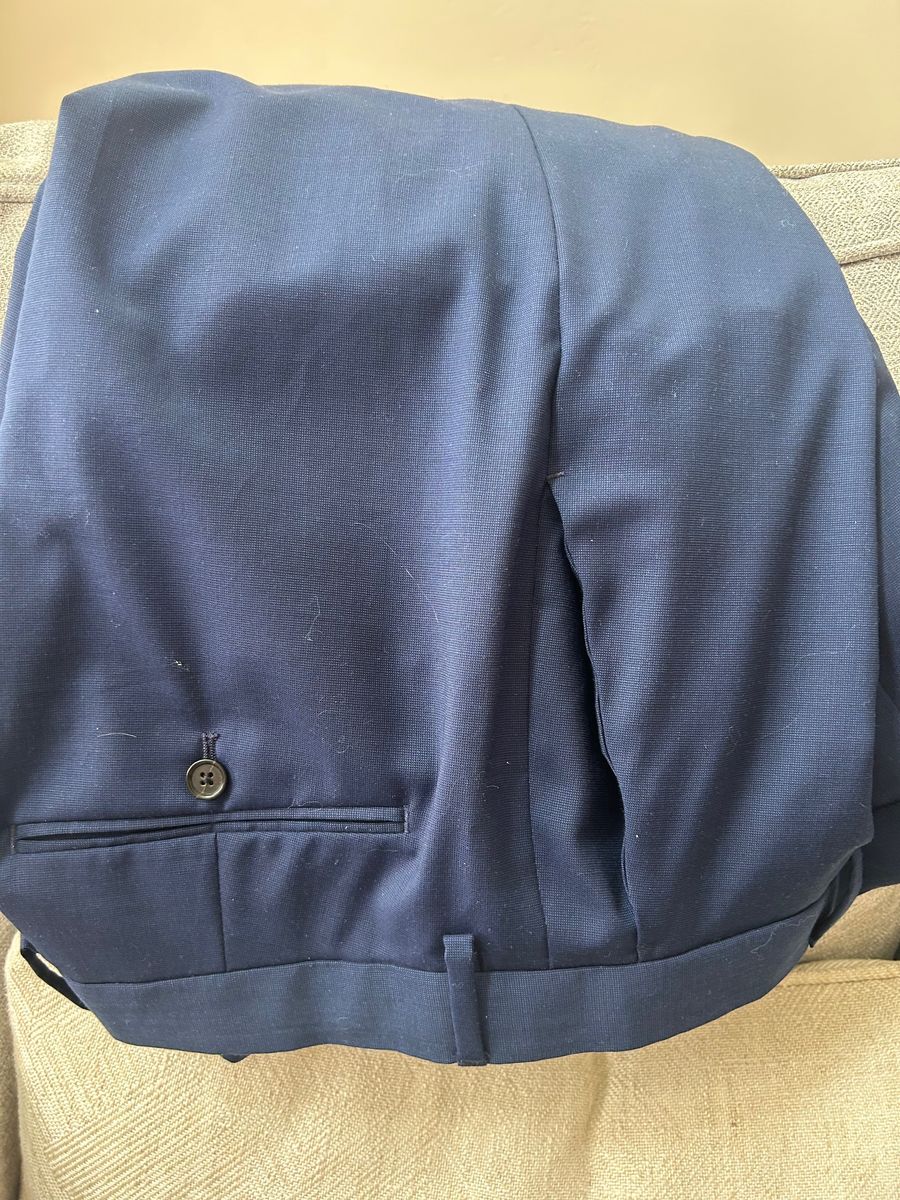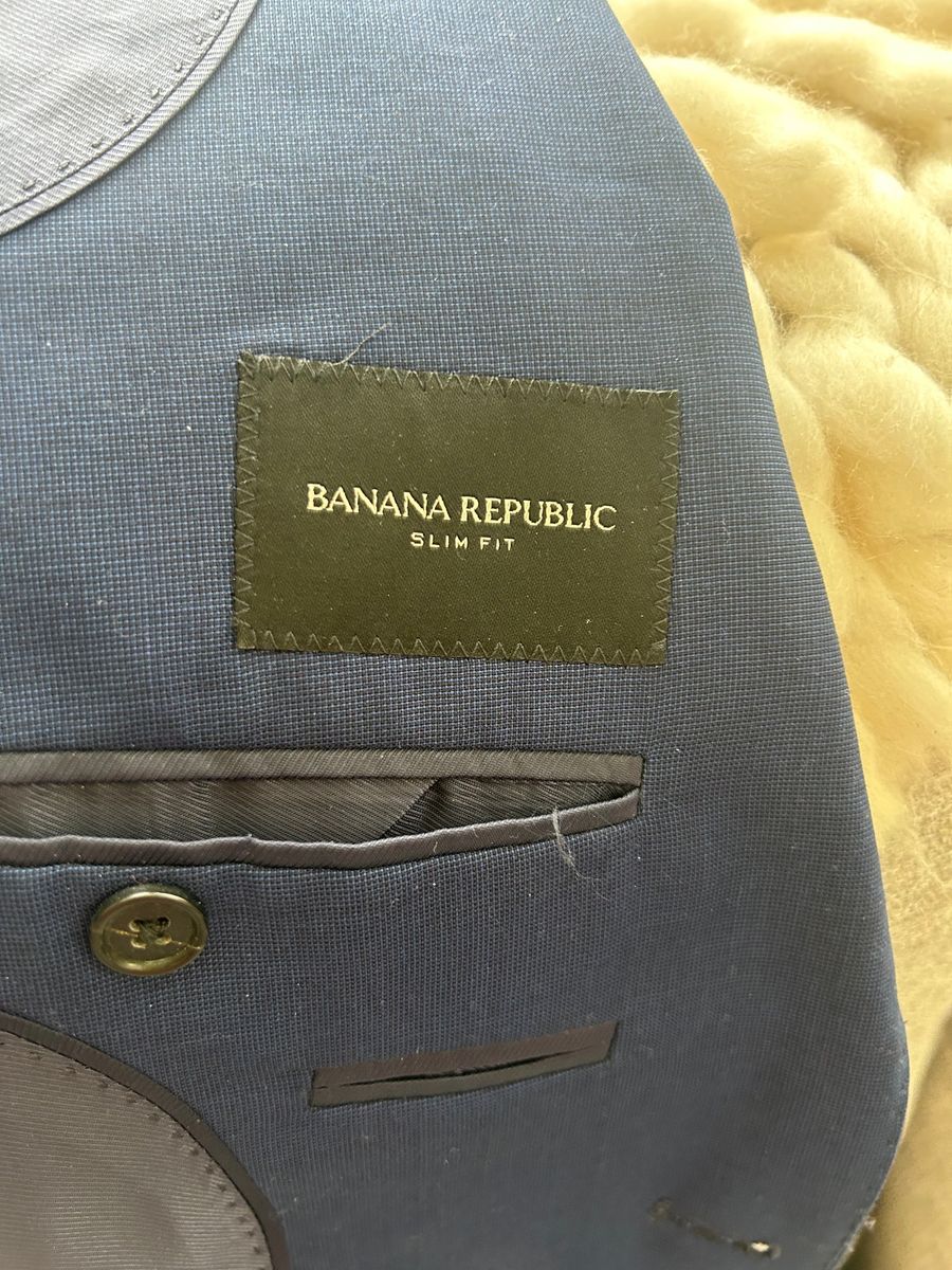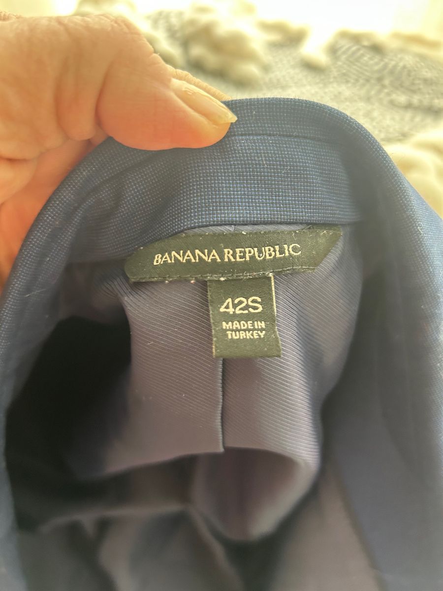 This Banana Republic suit offers a beautiful subtle blue windowpane pattern. Suit and pants are in excellent condition. Jacket is 42 Slim; pants are 32 x 30. Suit is perfect for an upcoming graduation or church.