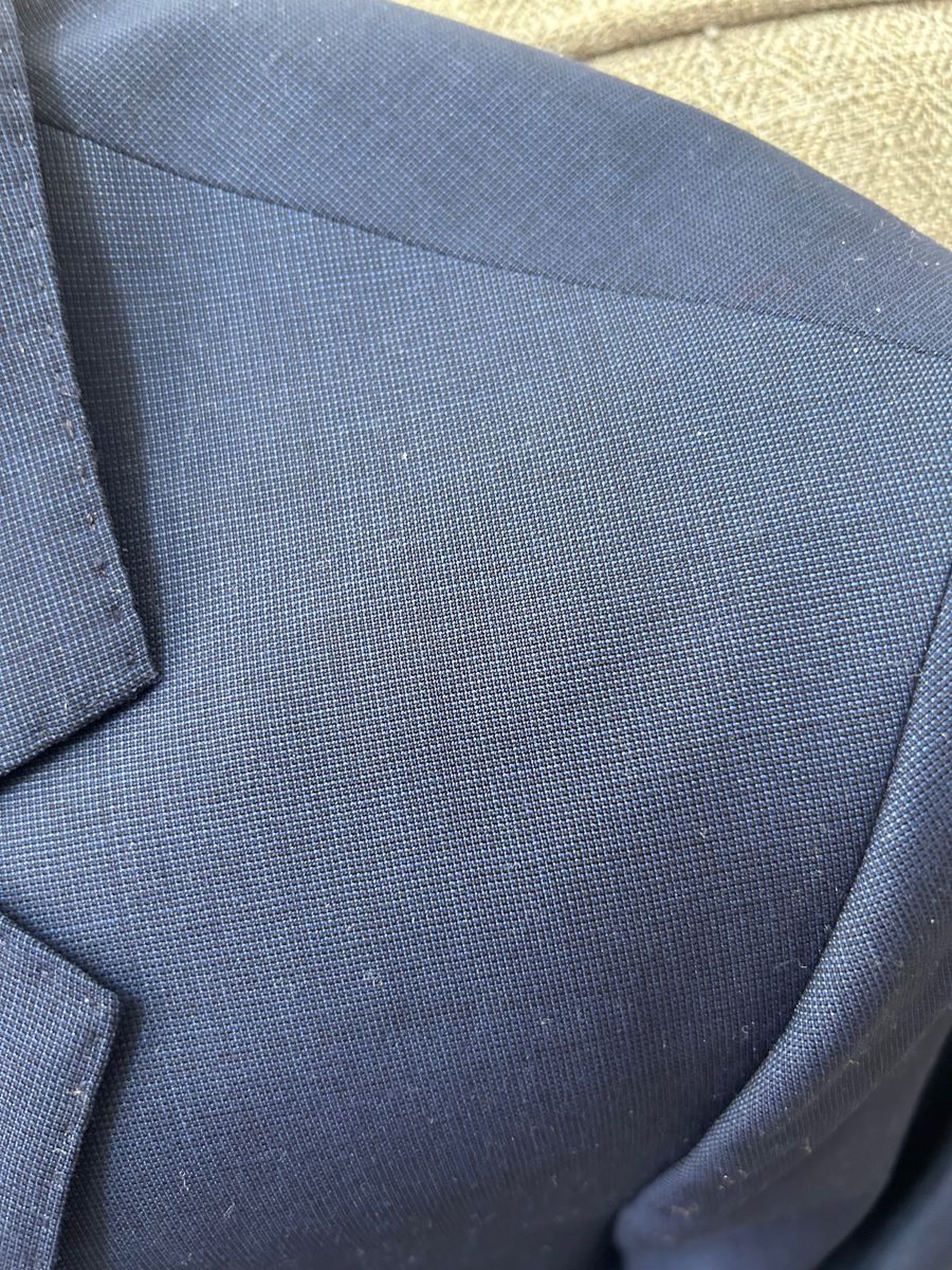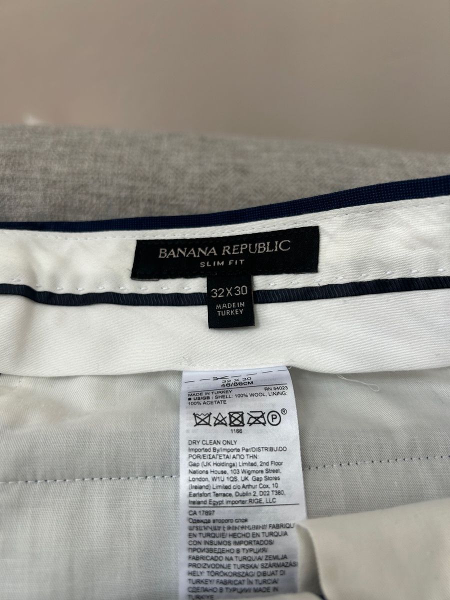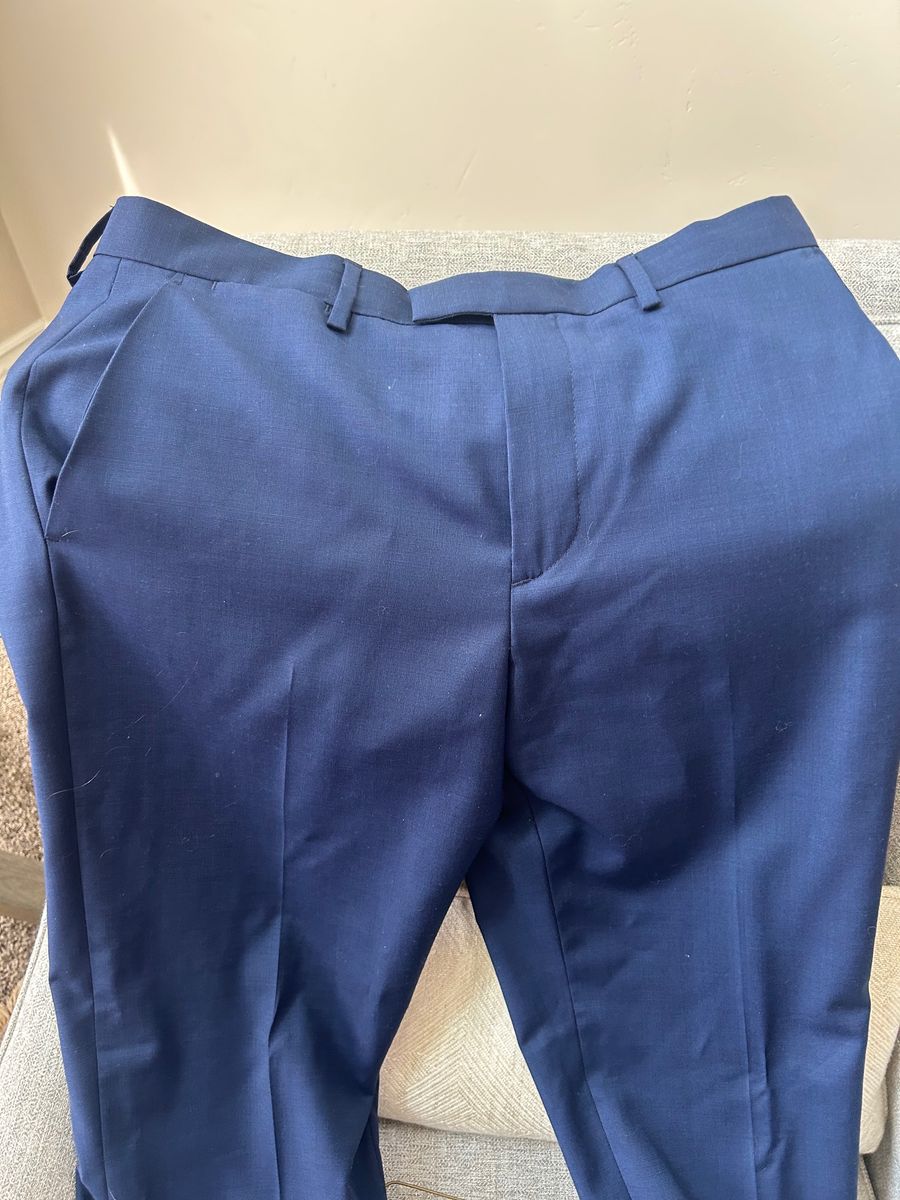 This Banana Republic suit offers a beautiful subtle blue windowpane pattern. Suit and pants are in excellent condition. Jacket is 42 Slim; pants are 32 x 30. Suit is perfect for an upcoming graduation or church.