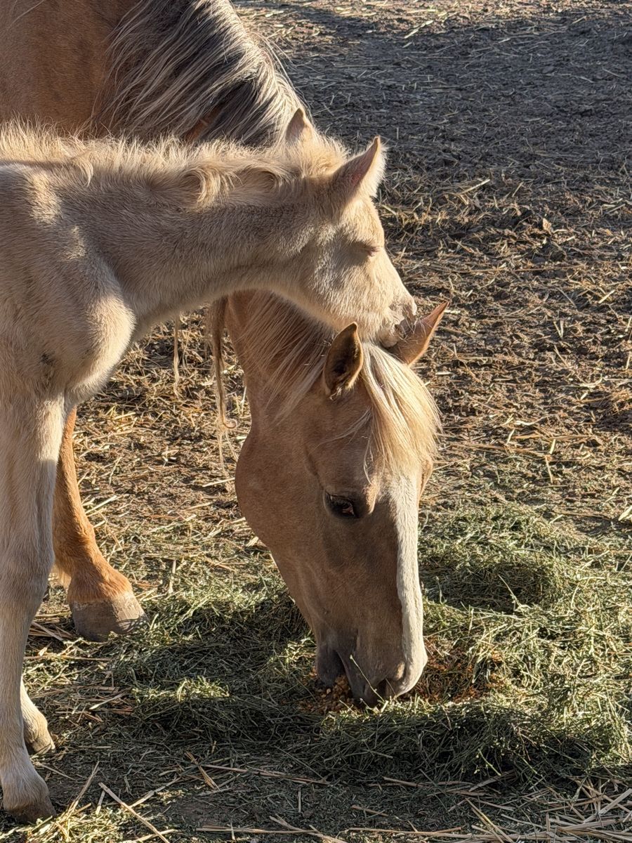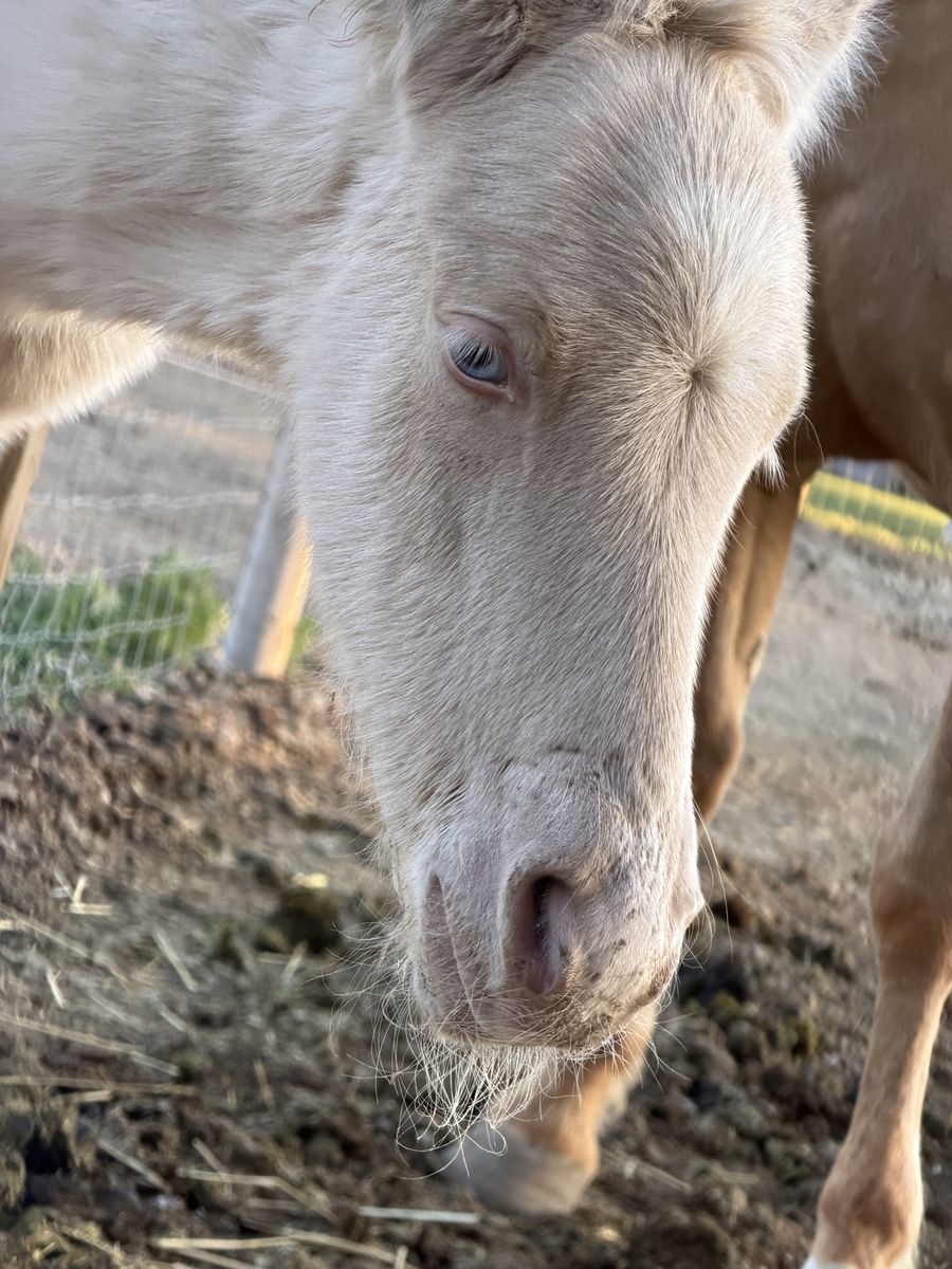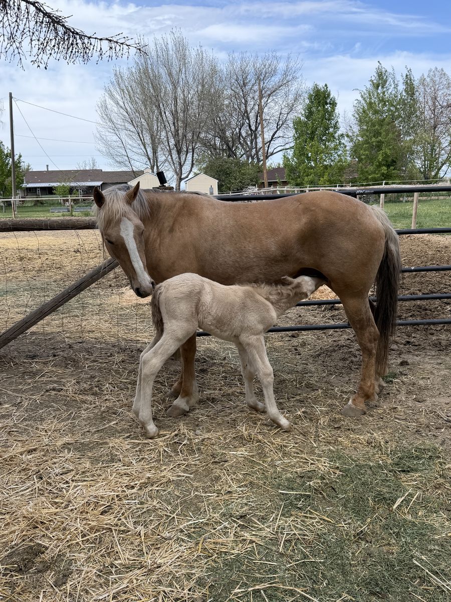 Palomino Mare and Perlino colt. Palomino is a titled mustang about 14’3 tall needs lots of work does get trimmed every 10 weeks, baby colt is mustang, gypsy - quarter cross. Sire is a Buckskin (last picture) out of a Grullo quarter horse and Gypsy buckskin stud. Colt has two beautiful blue eyes and is a sweetie and will give you some beautiful colors. He was born 4/25/26. Located in Kimberly Idaho