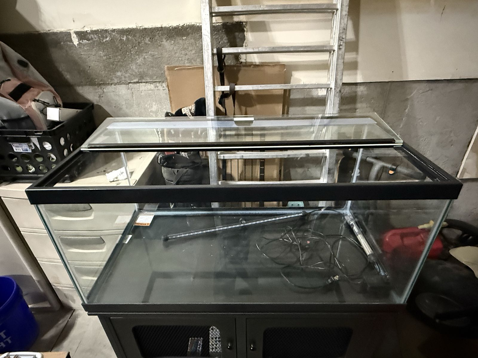 Venmo40 Gallon LED Lighted Fish Tank. Has a glass top that opens and a heater. Stand also has lights inside the storage area. Each light bar has remotes for controlling the lights and colors of the lights. In good condition. Hardly used.