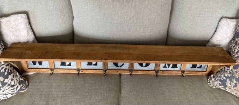 Nice "NEW" Farmhouse Style Wall Shelf that says WELCOME, with 6 hooks for all your entryway or home decor. Wall mounted, Smoke free home.. Helping family members that moved. Measurements are: 50 1/2 in Long x 6 in Deep x 6 in Tall