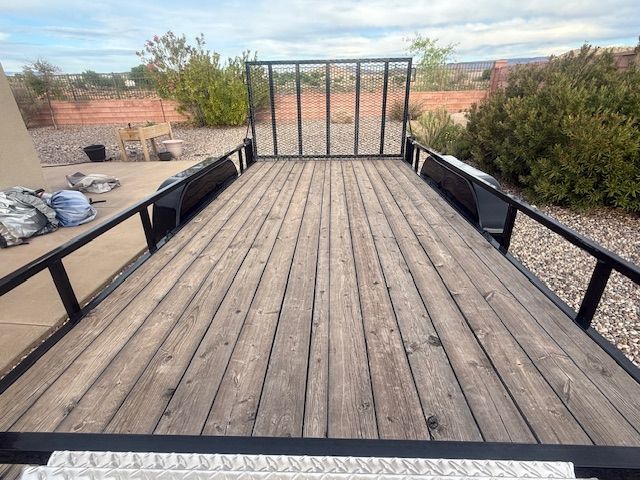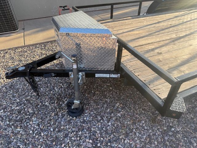 Features: 7K tandem axle, Diamond plate tongue tool box, 15" spare tire, rear loading gate, and wood deck.