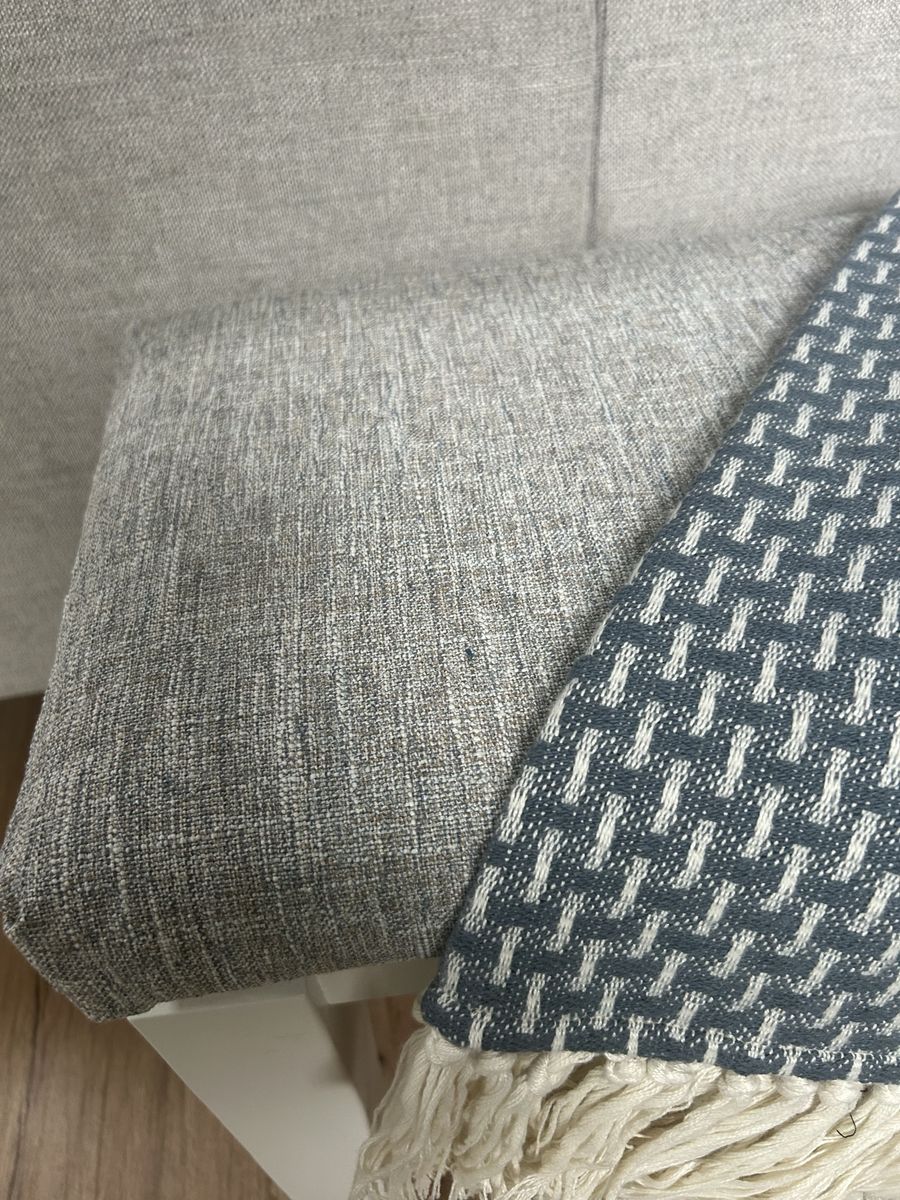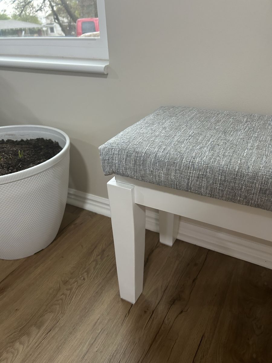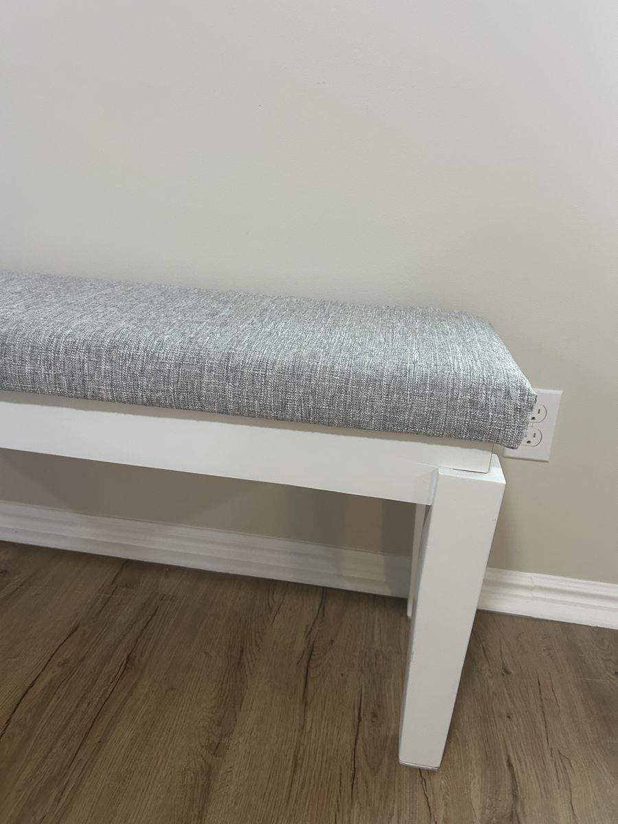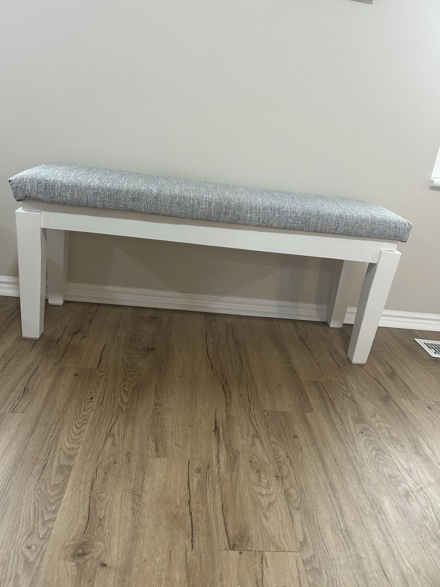 VenmoWhite bench with blue/gray seat 44 x 13 top. 18” tall