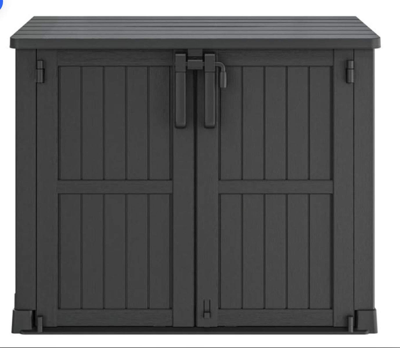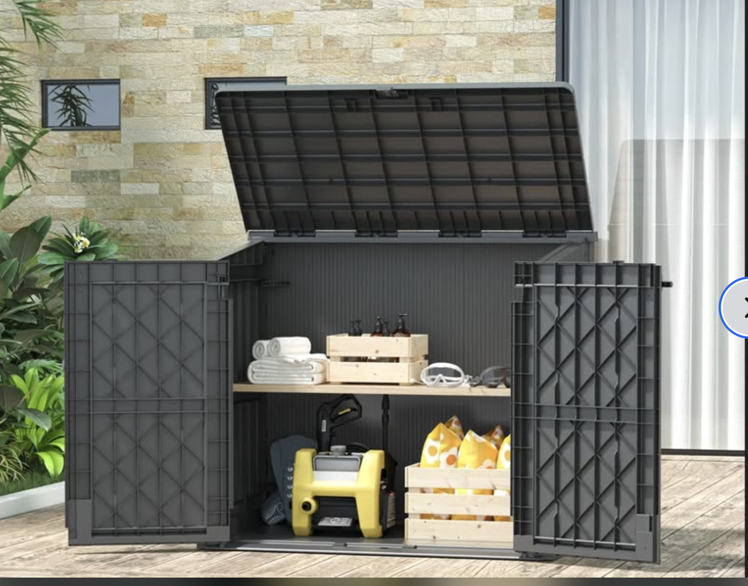 Brand new in box, unassembled, 51.1''W Outdoor Resin Horizontal Storage Shed-280 Gallon, black overall.. 43.3'' H X 51.1'' W X 29.1'' D Made from weatherproof, UV-resistant materials, it’s built to handle all seasons and protect your essentials. With quick and easy assembly, you'll have a spacious solution for storing tools, garden equipment, and more in no time. The double-lock design keeps everything secure, and its sleek design adds style to any yard or patio. Maximize your storage and minimize clutter—this shed is a must-have for any outdoor area! EXTRA LARGE STORAGE CAPACITY - Externally, this storage shed measures 51.1'' W * 29.1 '' D * 43.3'' H, with a capacity of 280 gallons; perfect for storing gardening tools, small lawn mowers, bicycles, garden furniture and 2 small bins. You can add another laminate shelf (48x13 inches, sold separately), if you want to reduce clutter and save space, placing a storage shed in your yard, garden, backyard, living room or pool is a good choice. DOUBLE LOCKING DESIGN - The top of the cabinet is pre-drilled with locking holes, and the bottom latch can be used for foot switches without the need to crouch down. Two locks ensure your items are safe and intact outdoors. Lever-supported flap facilitates quick and easy storage of your items. ALL-WEATHER RESISTANT - This storage shed is made of UV-resistant resin for all-weather use, easy to clean and maintain; the complete box top and slot splicing makes the storage box excellent waterproof ability. DUAL PANELS - The outdoor storage shed is made of double-layer resin panels, which are treated with advanced technology to provide stronger wind and impact resistance; not easy to bend or puncture; can safely store valuable tools and equipment.