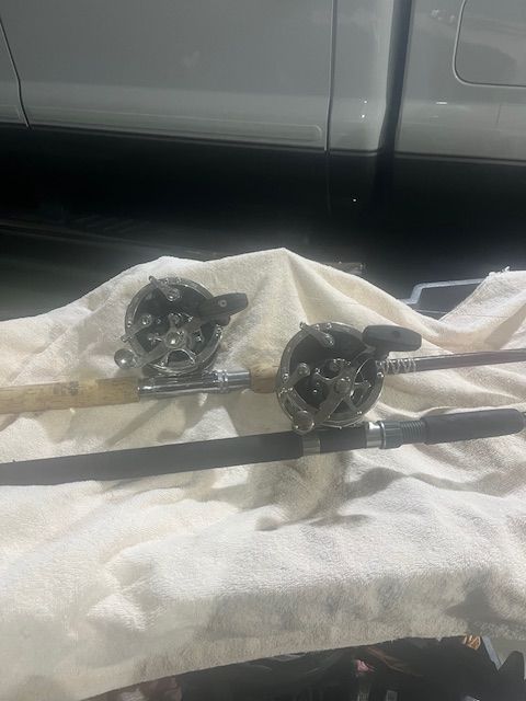 Penn 49 Mariner deep sea reel with approx. 300 yards of 125lb test steel line. Mounted on an eight foot Cabelas depth master trolling series rod.