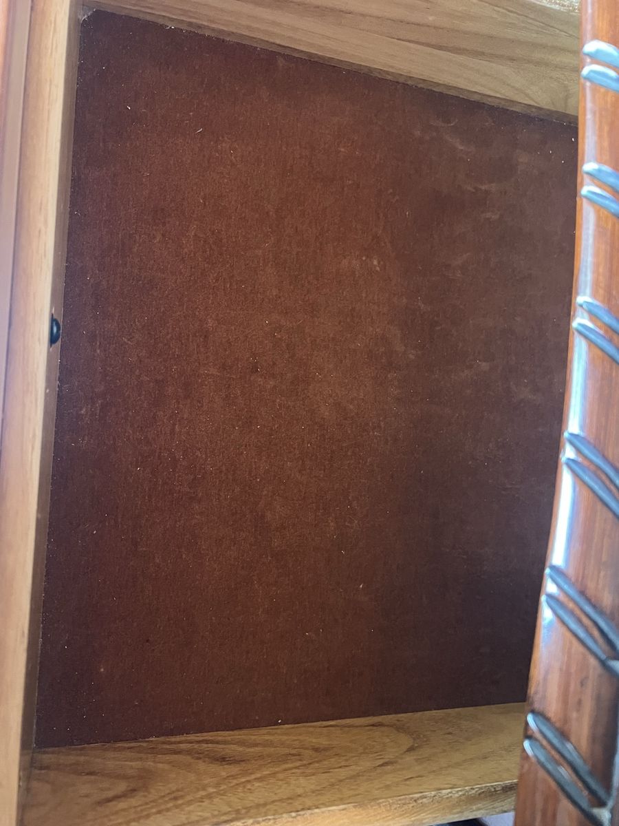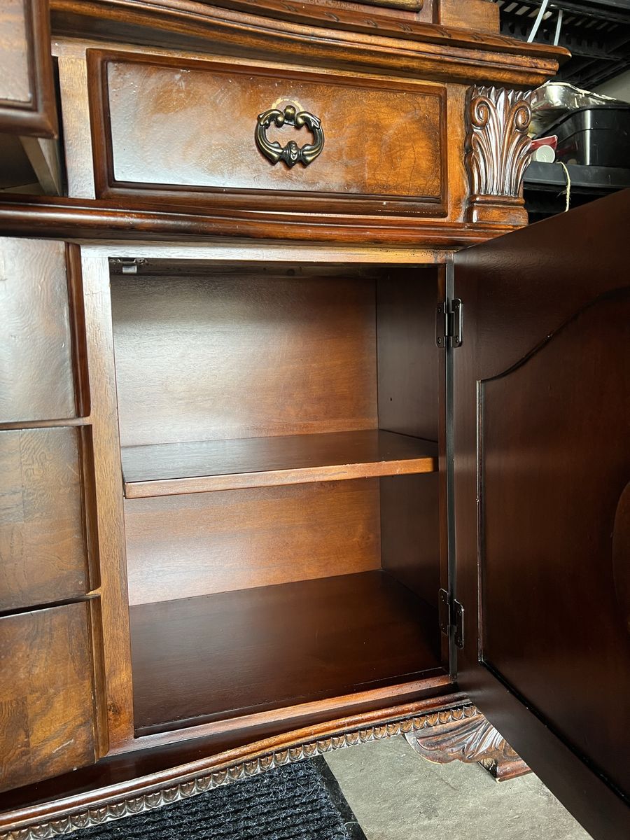 The buffet has six felt-lined drawers (center drawer for cutlery/utensils) and two wood doors to cabinets on each side.