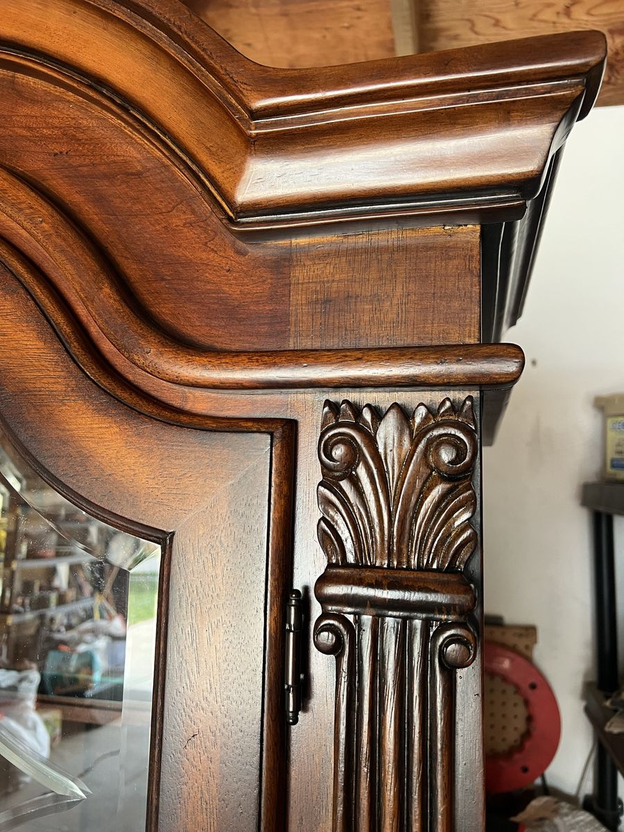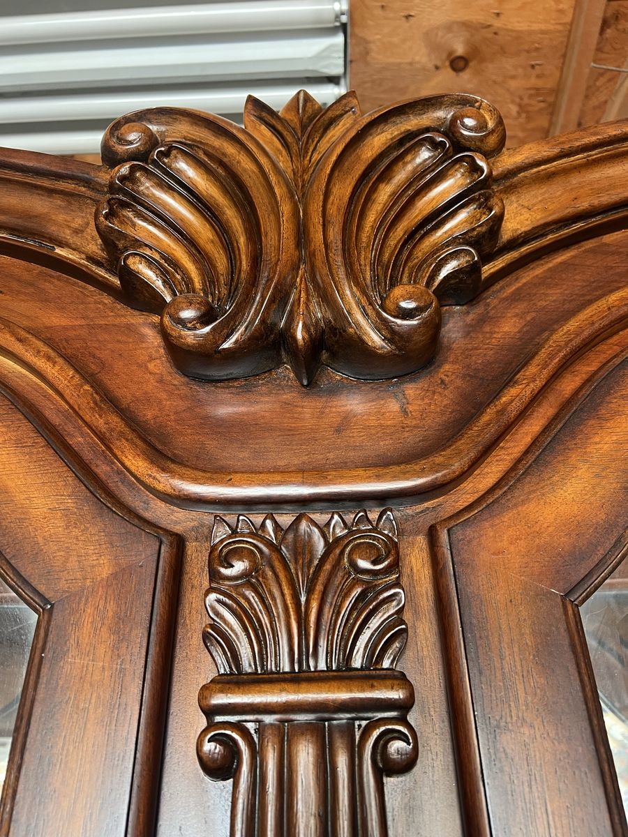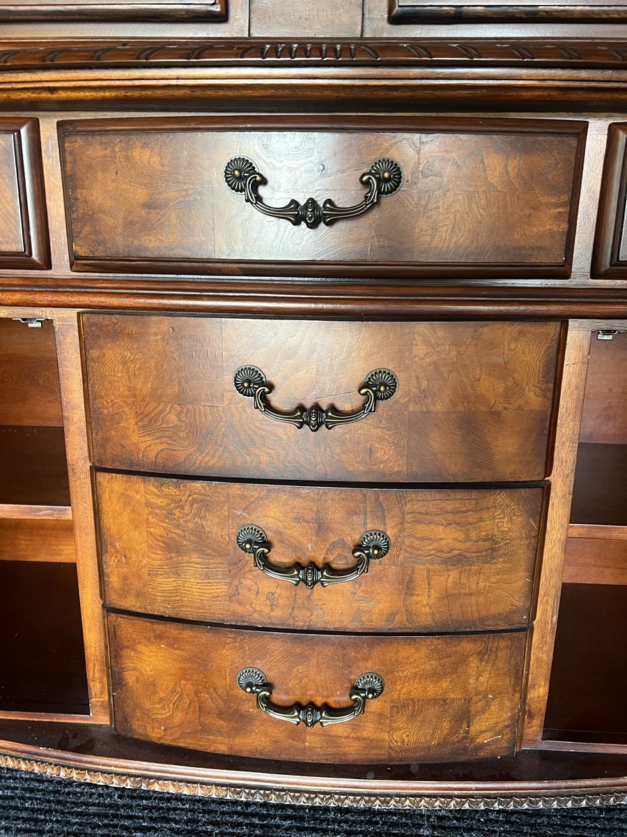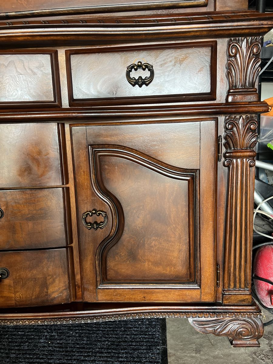 This is a 2-piece warm, brown cherry wood set with a mirrored glass hutch on top of a multi-drawer cabinet base with ornate carvings and antique style hardware.