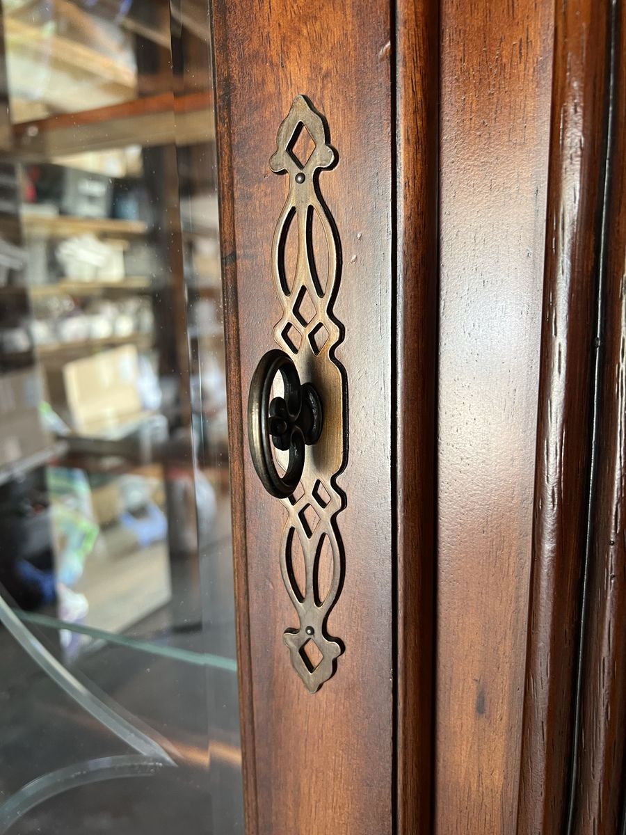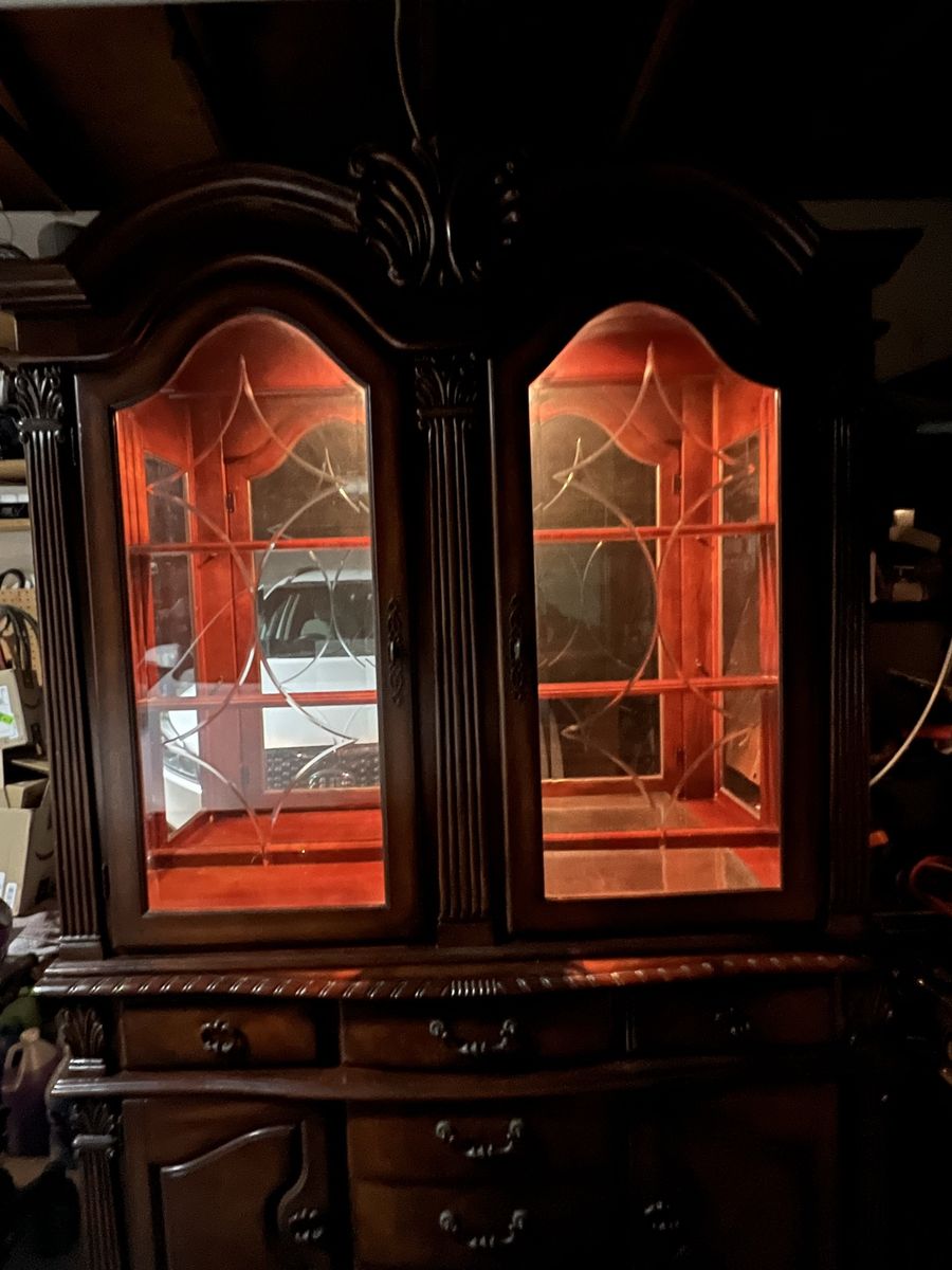 The mirrored hutch has two glass-fronted doors with four pieces of glass shelving to display items. It also has interior lighting to highlight collectibles.