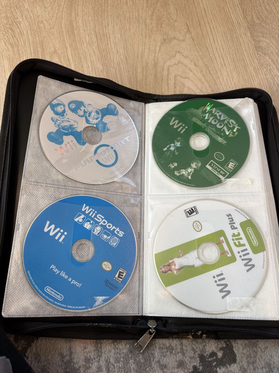 It comes with 4 used and slightly scratched games. Mario kart, harvest moon, Wii fit, and Wii sports.