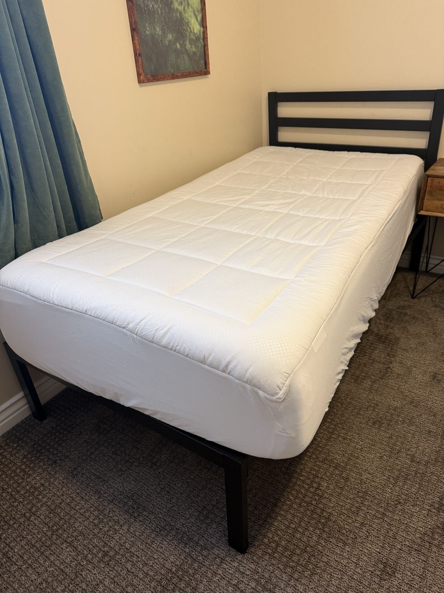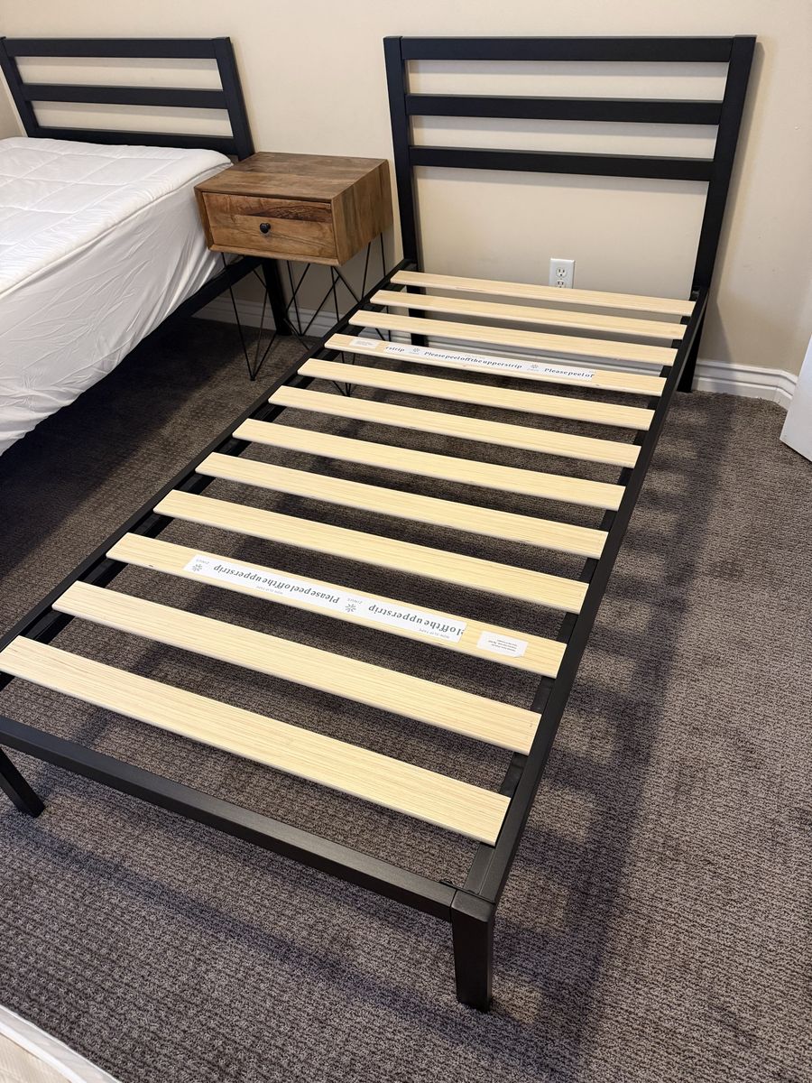 • 2 sturdy black metal twin bed frames with headboards • 2 twin mattresses in great condition • 1 wooden nightstand included
