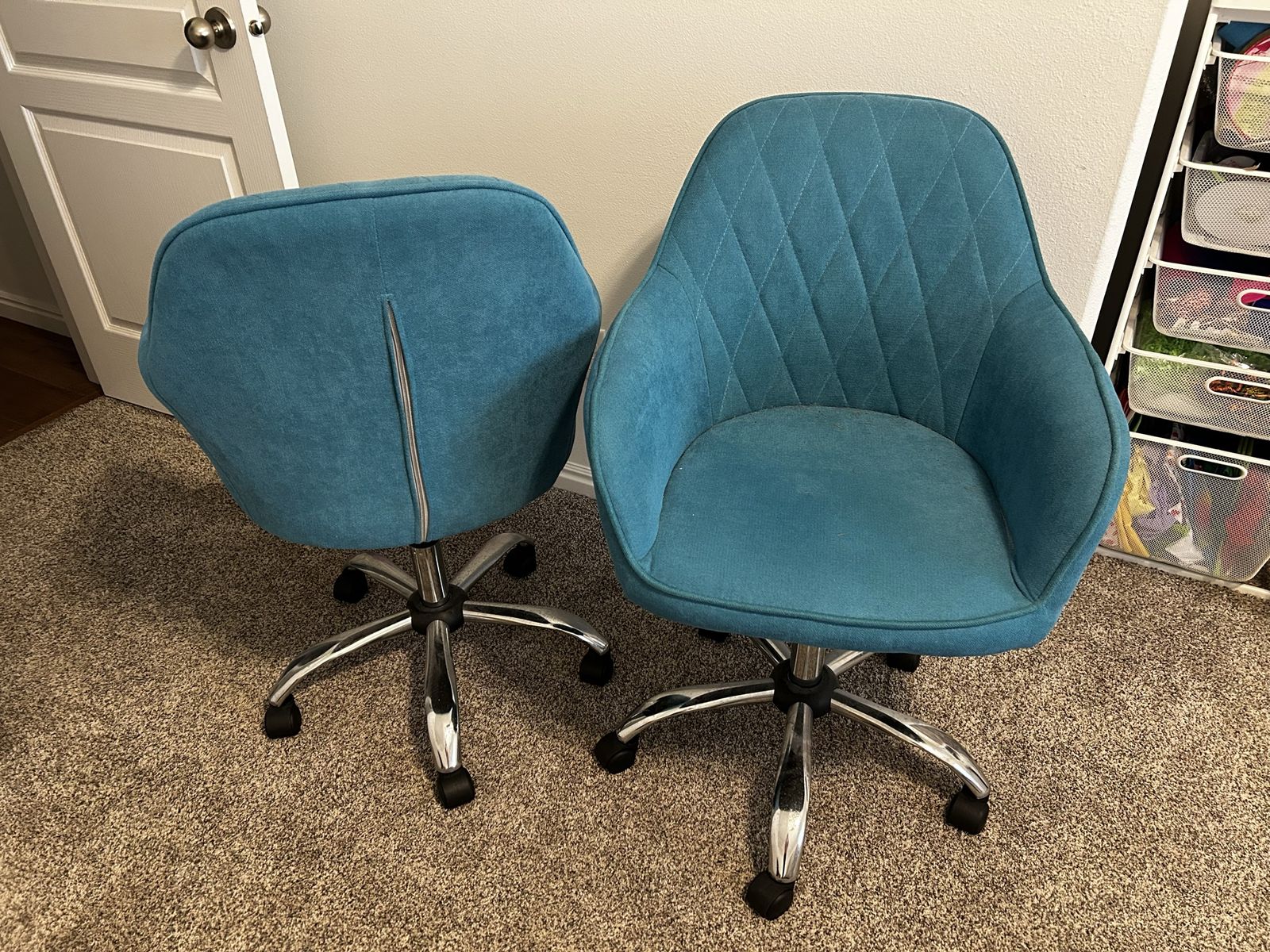 2 blue aqua office chairs. They have height adjustment and swivel. Hardly been used. $30 each or $55 for both.
