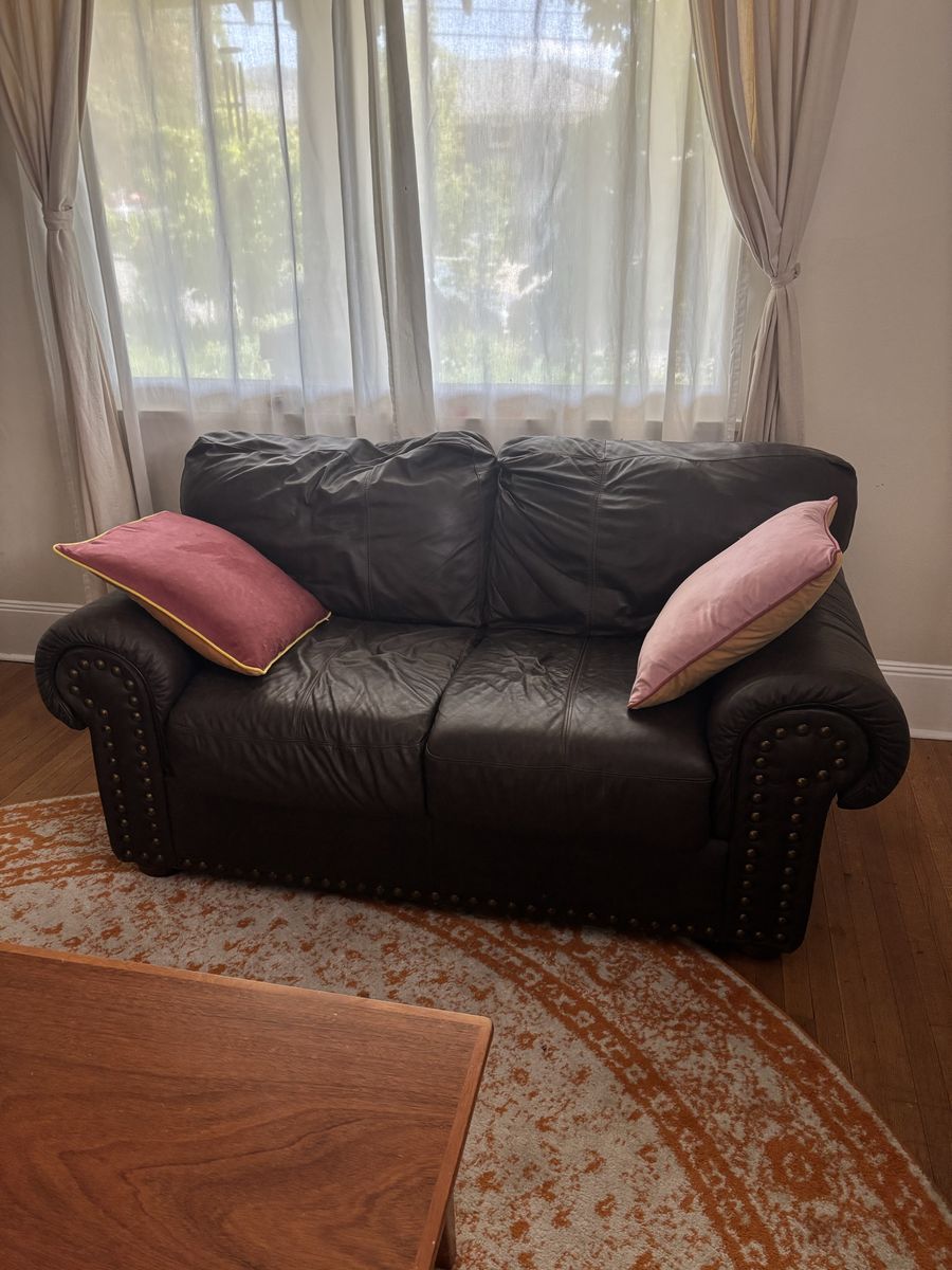 Matching leather couch and loveseat set. Solid, comfortable pieces that still have plenty of life left - great for a starter home, rental, or someone who doesn’t mind a bit of wear.