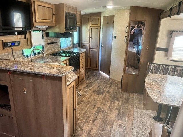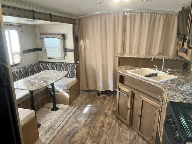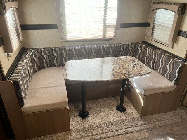 The slide out booth dinette provides plenty of seating for meal times and more. The slide makes the interior a little more spacious by opening up the walking space that leads to the front queen bed area.